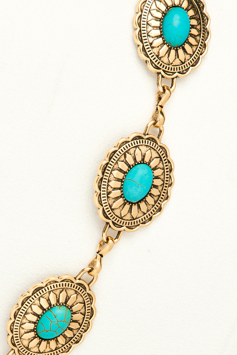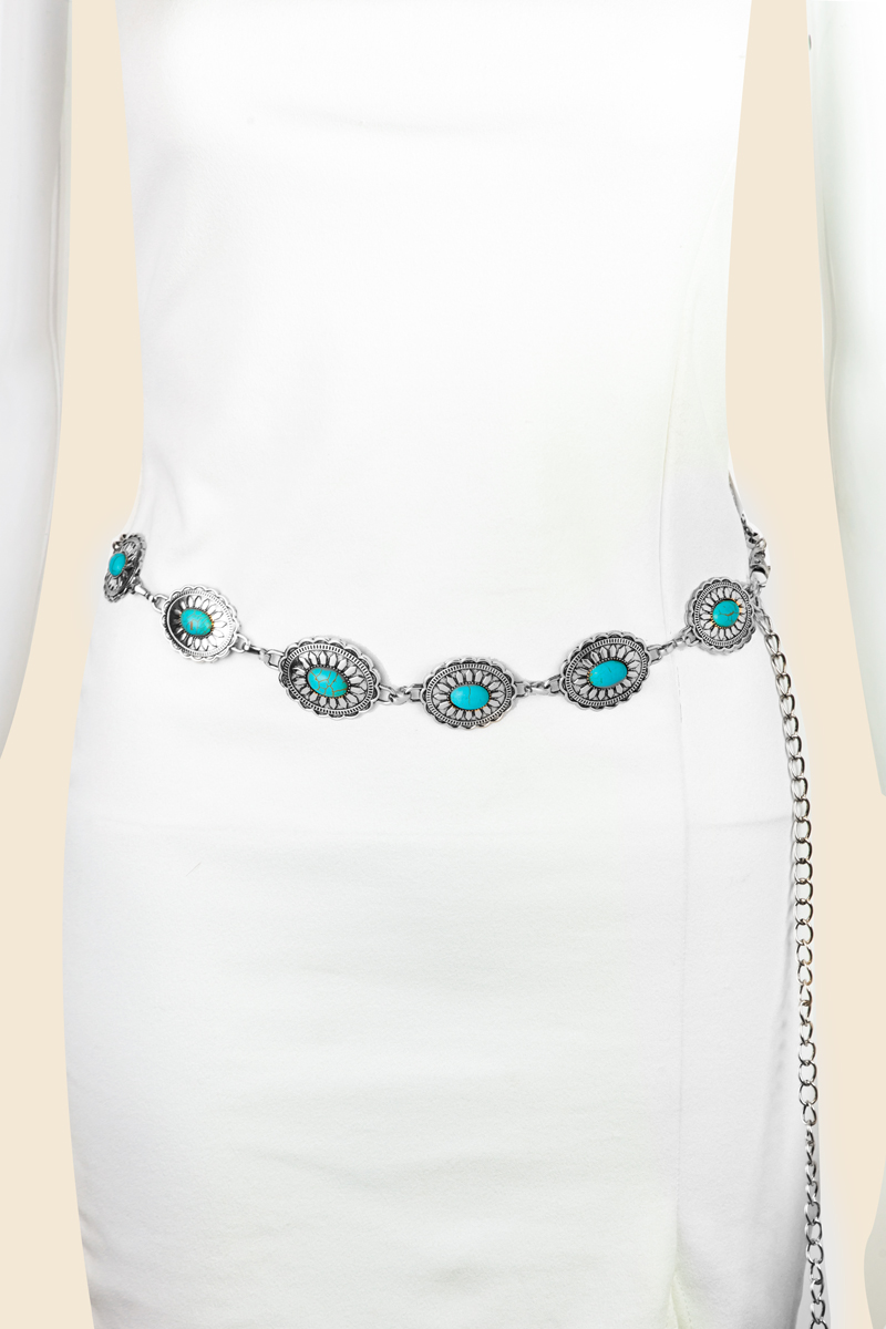 • Add a touch of elegance and glamour to your look, this chain belt contains a special floral turquoise concho disc design. Elevate your fashion game with this versatile chain belt, seamlessly integrating into your signature style. Available in G, S. This item is sold in packs of 1.