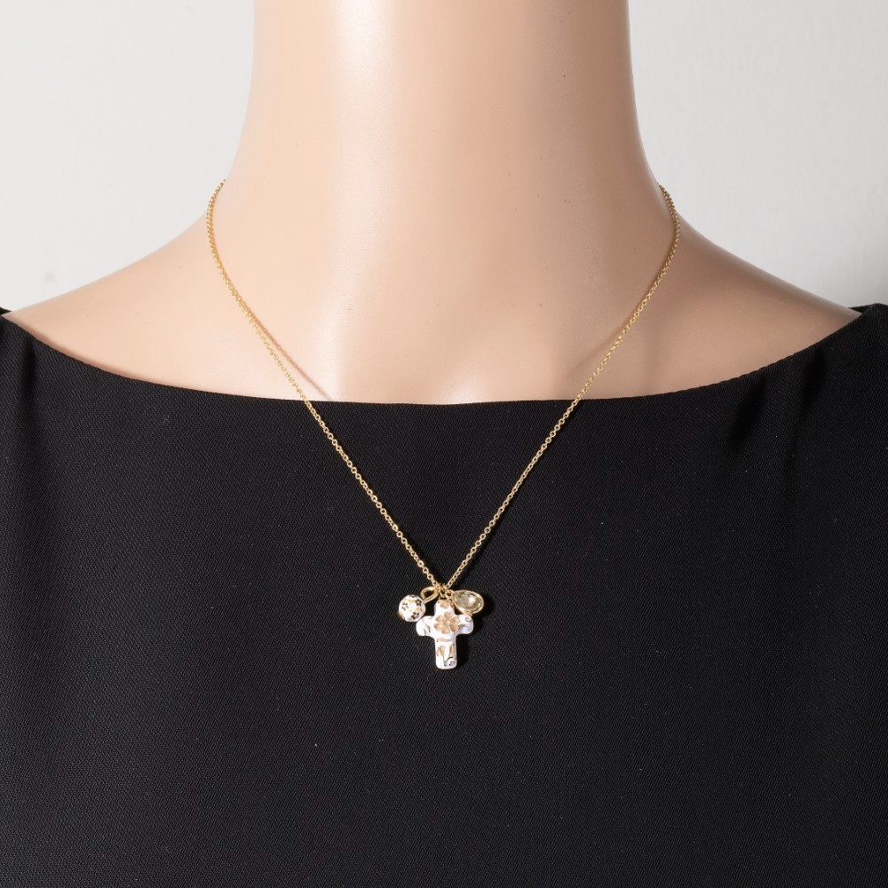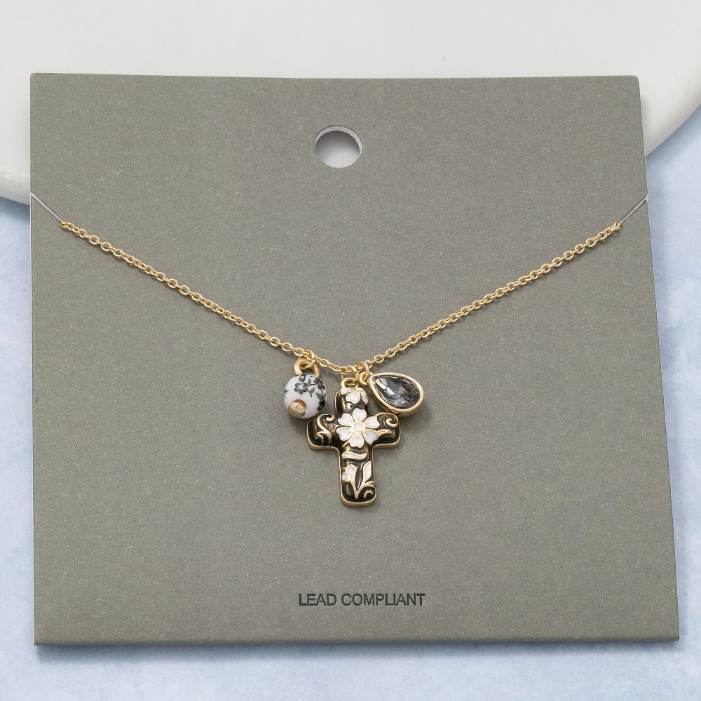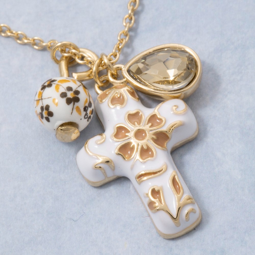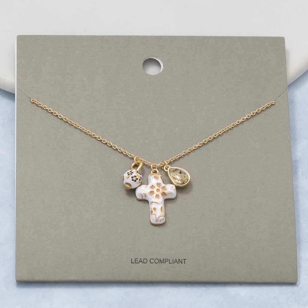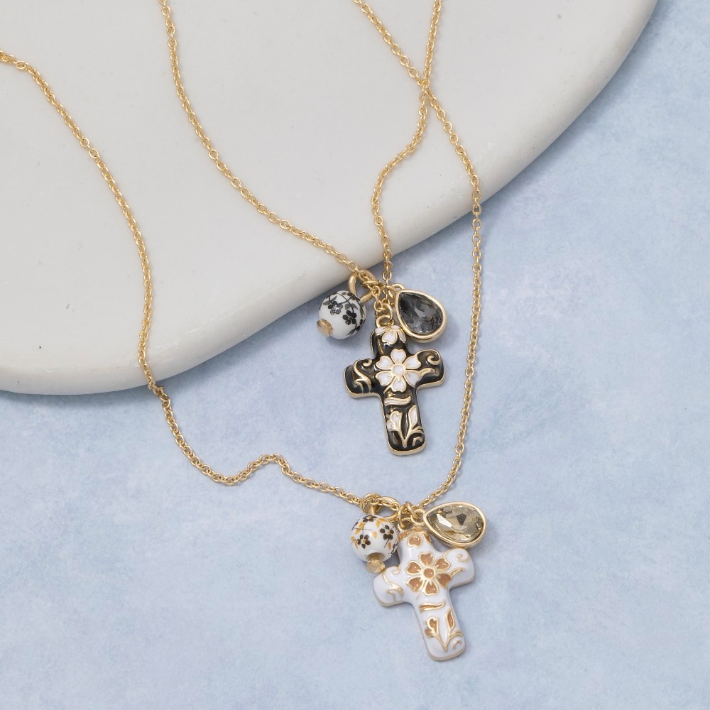 • Add a touch of elegance and glamour to your look, this chain necklace embodies a sophisticated ceramic floral cross and bead charms design. A chic and sophisticated chain necklace that's perfect for dressing up or down. Available in GDBNW, GDMIV. This item is sold in packs of 1.