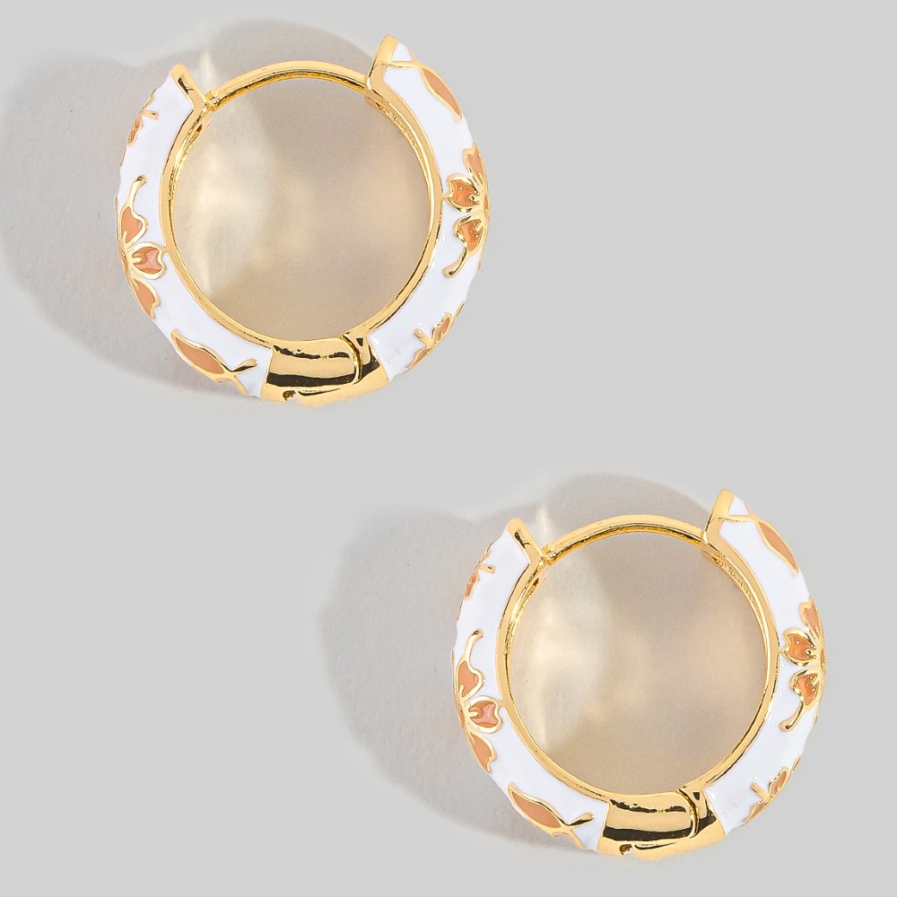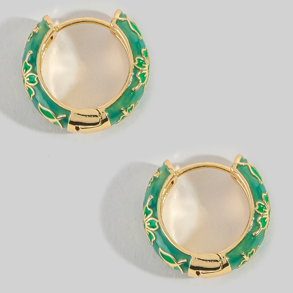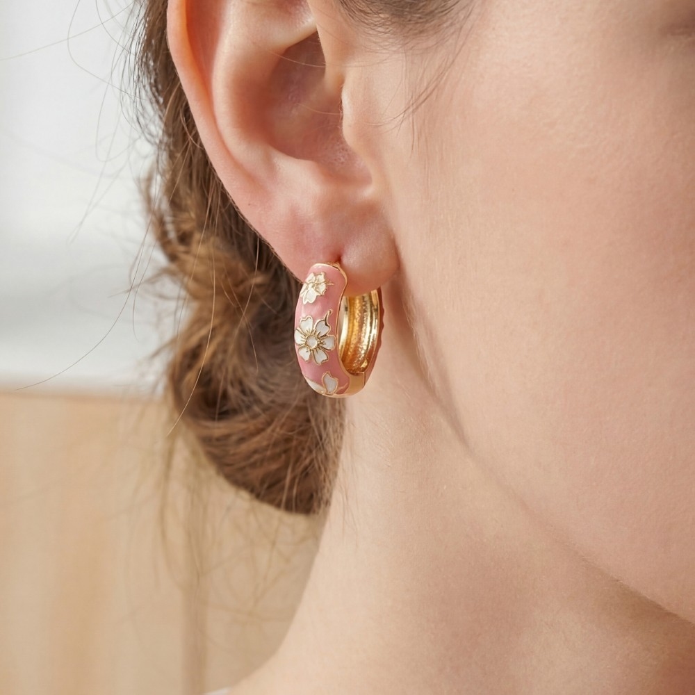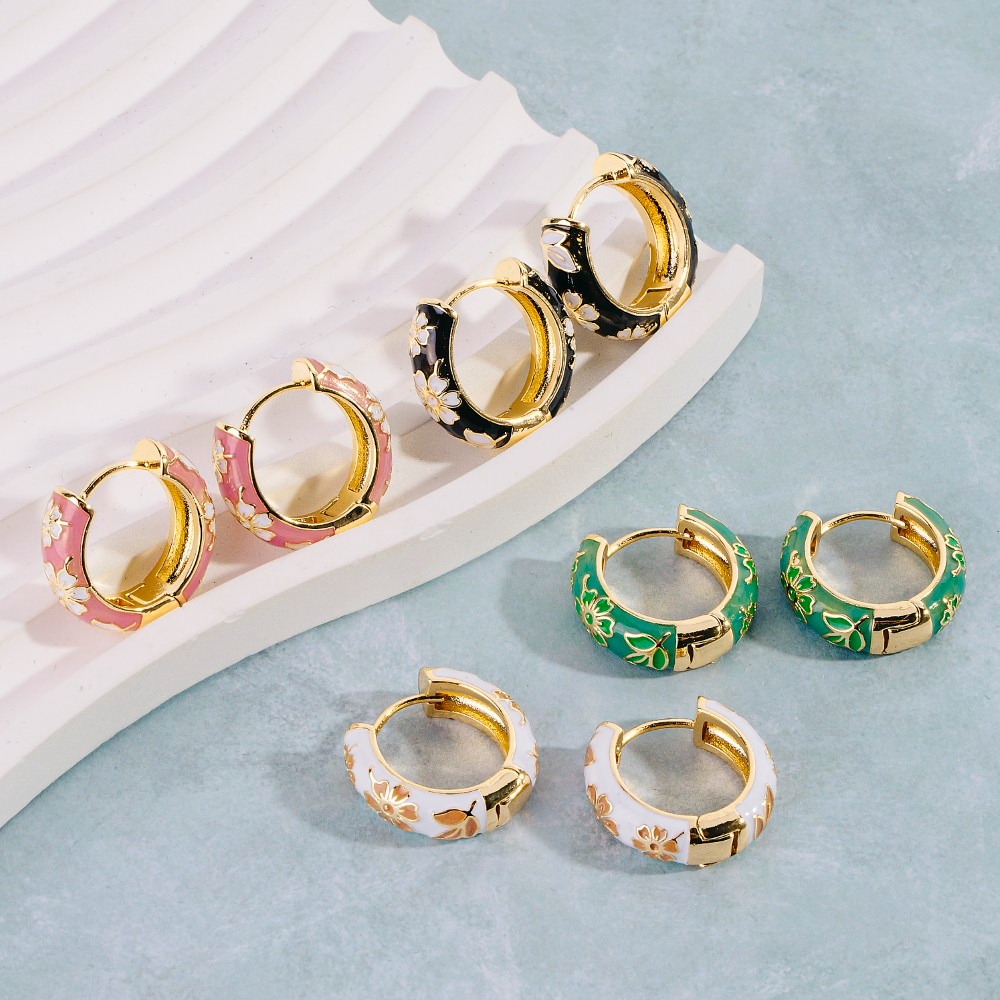 • Add a touch of luxury to any outfit, this pair of hoop earrings showcases a breathtaking floral ceramic hinge design. This item is ideal for those who want to add some personality to their outfits without being too bold. Available in GDBNW, GDGRN, GDMIV, GDPNK. This item is sold in packs of 1.