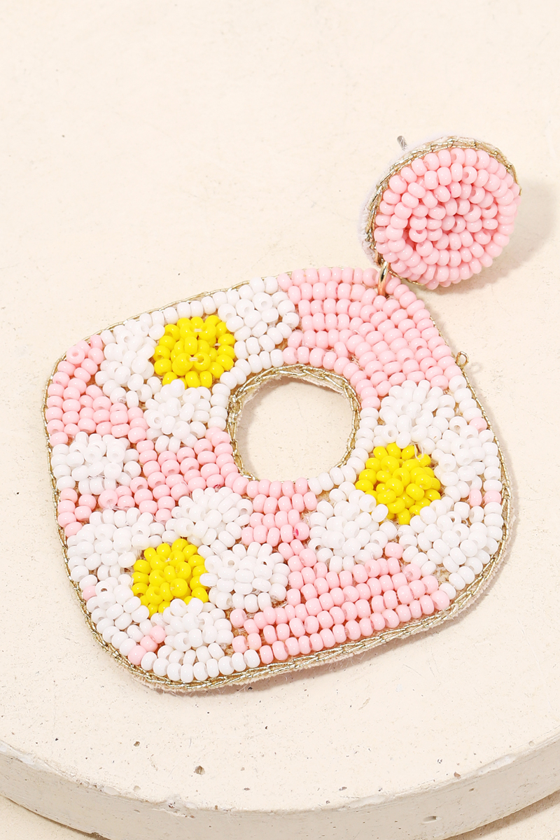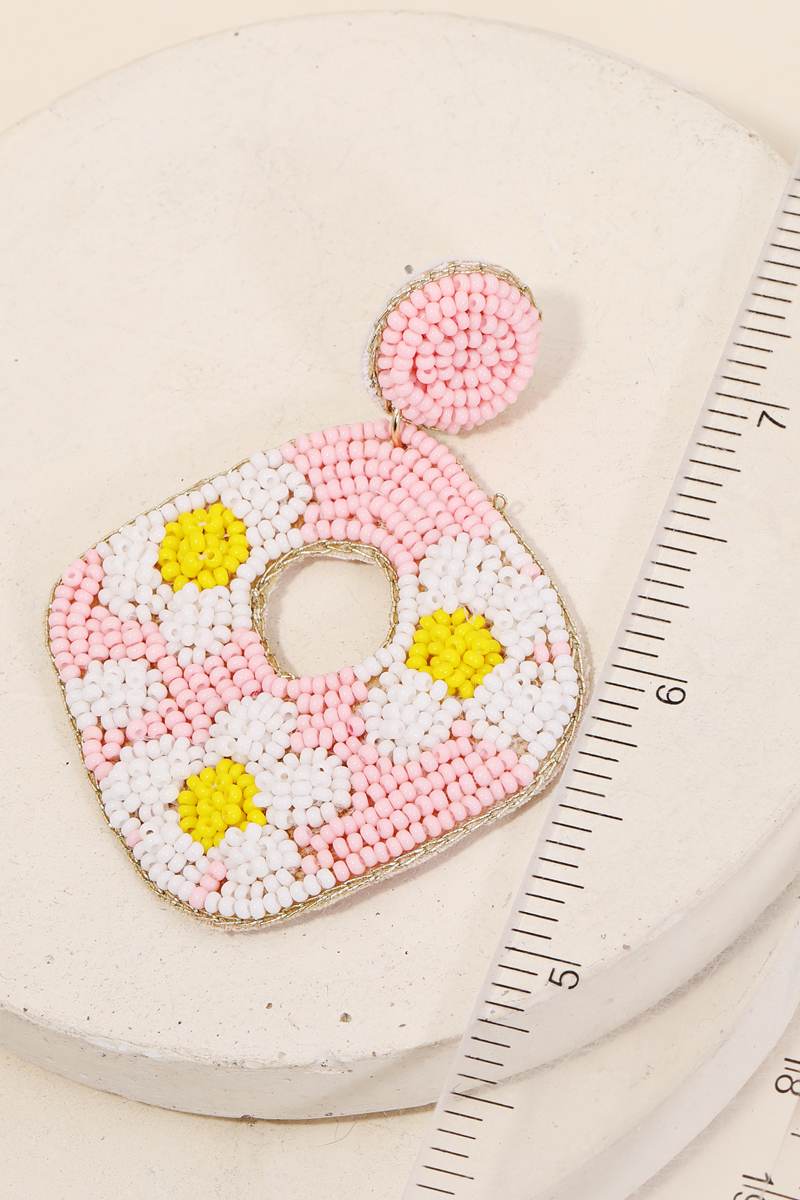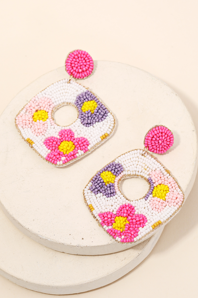 • Gorgeous in season trending must have pair of drop earrings features a floral seed beaded drop earrings design. Perfect for those who love making a fashion statement. Available in BK, BL, FU and MT. This item is sold in packs of 1.