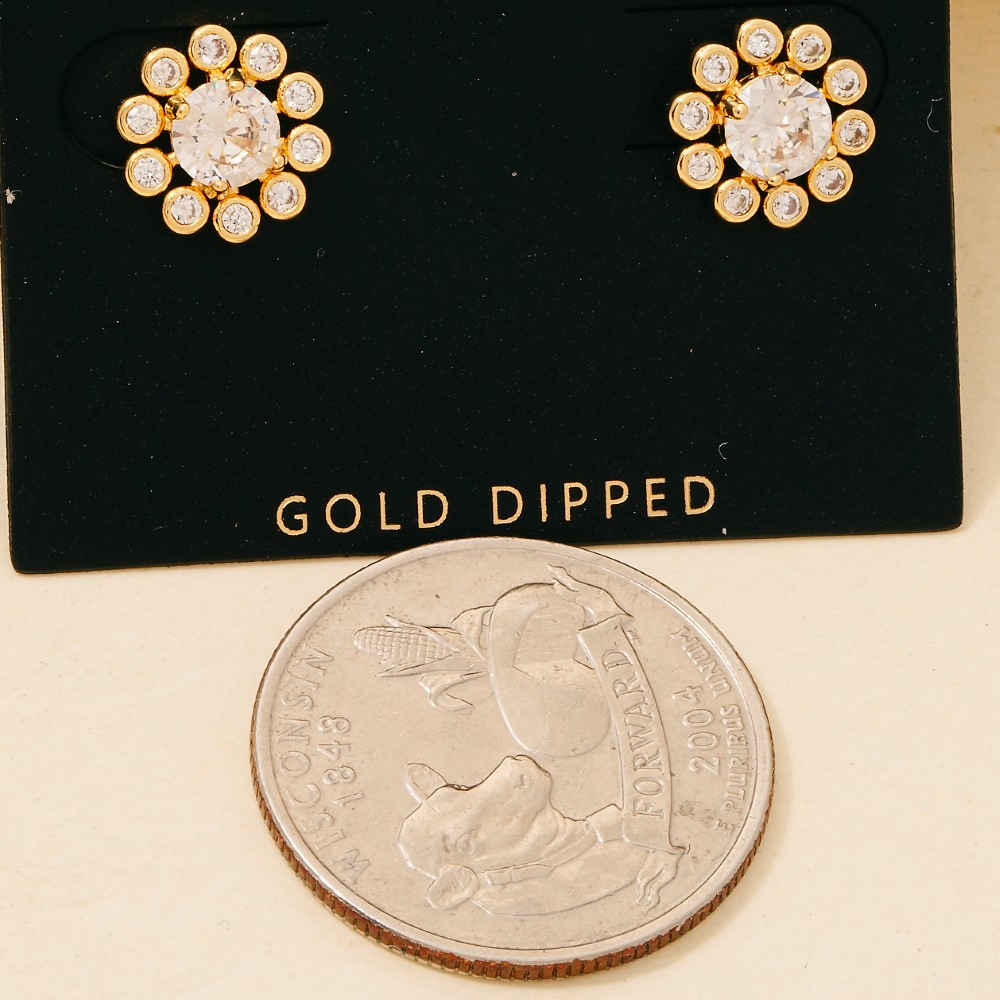 Perfect for any occasion, this pair of stud earrings reveals an intricate gold dipped cubic zirconia pave flower design. A must-have pair of stud earrings for anyone who loves to add some flair to their outfits. Available in NO COLOR. This item is sold in packs of 1.