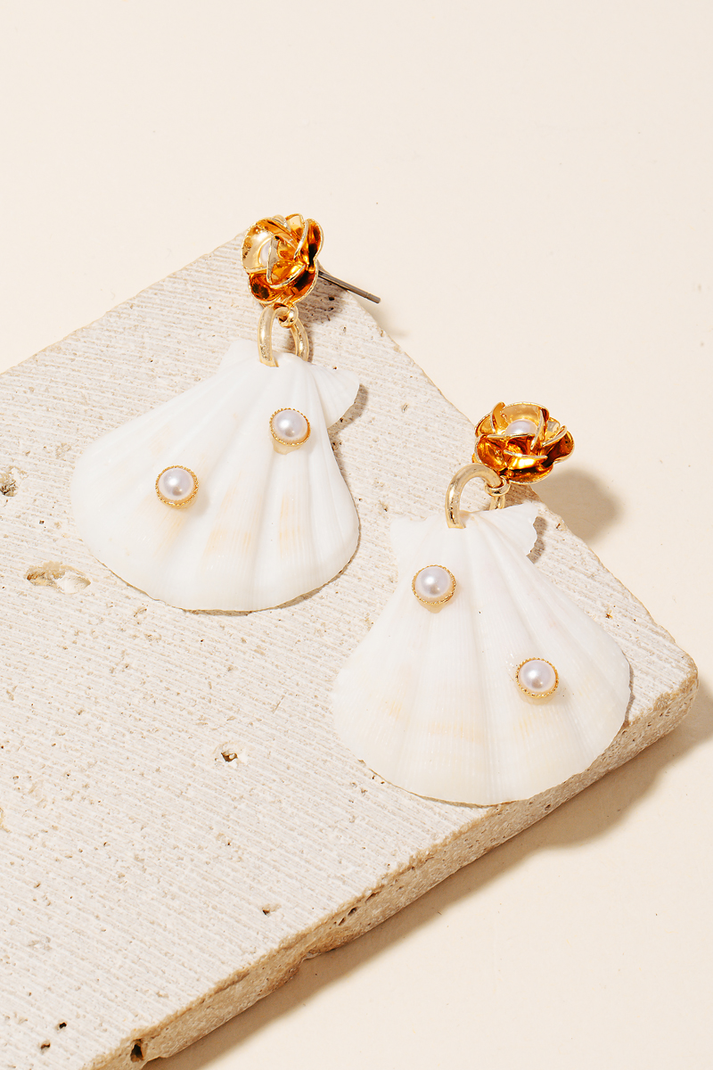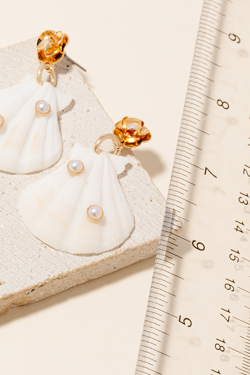 • This pair of dangle earrings showcases a unique metallic flower stud seashell style. Experience the joy of accessorizing with this piece that effortlessly combines versatility and charm.