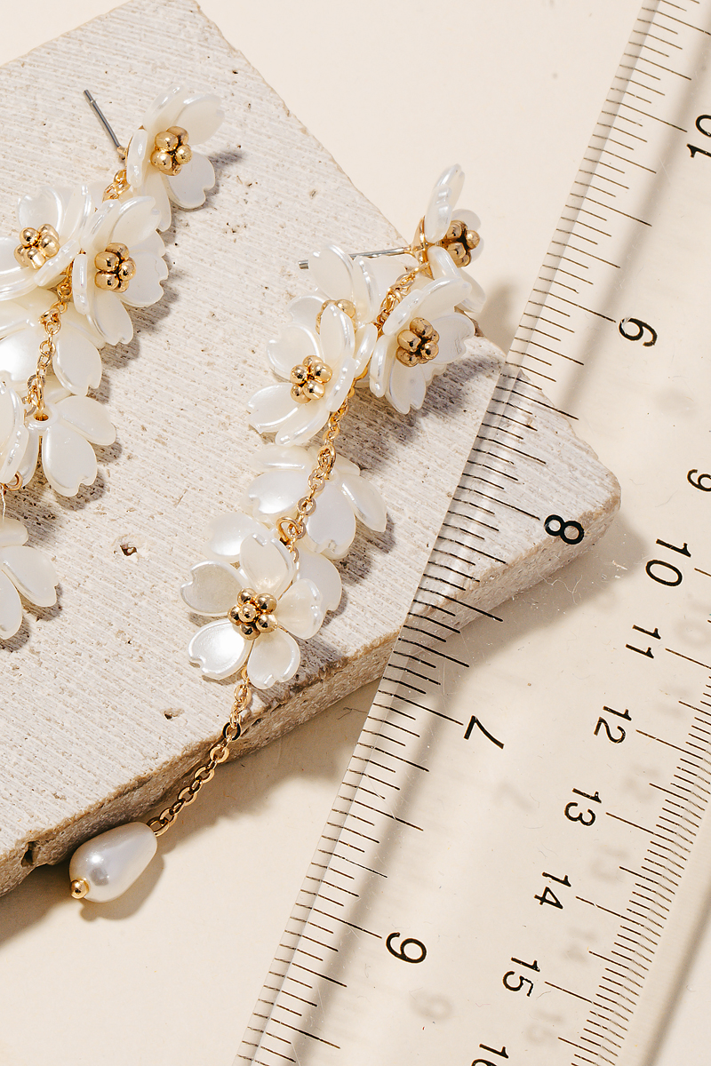 • This pair of dangle earrings introduces a stunning pearl flower charm chains and bead style. Savor the allure of detailed craftsmanship in this exquisite pair of dangle earrings.