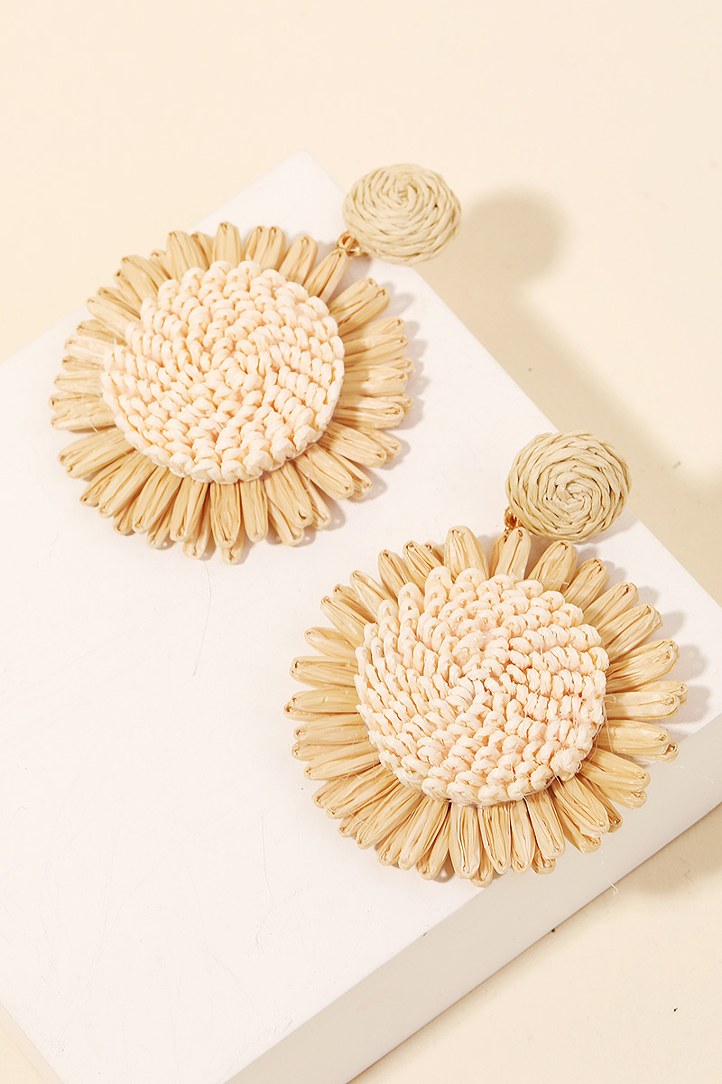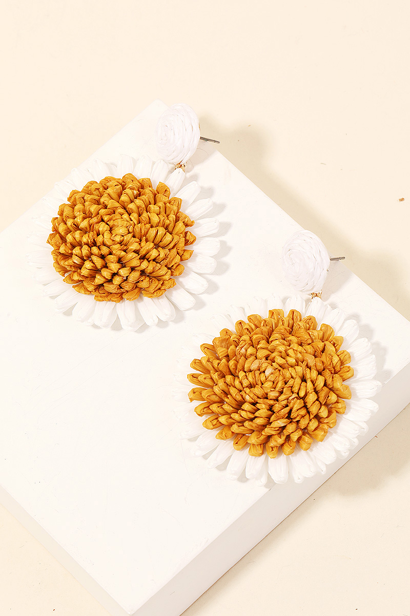 This piece is designed to be both stylish and functional, this pair of drop earrings carries a charming raffia sun flower design. Add a dash of sophistication to your look with this versatile accessory, a must-have for fashion enthusiasts. Available in FCH, IVY, LBR and WHT. This item is sold in packs of 1.