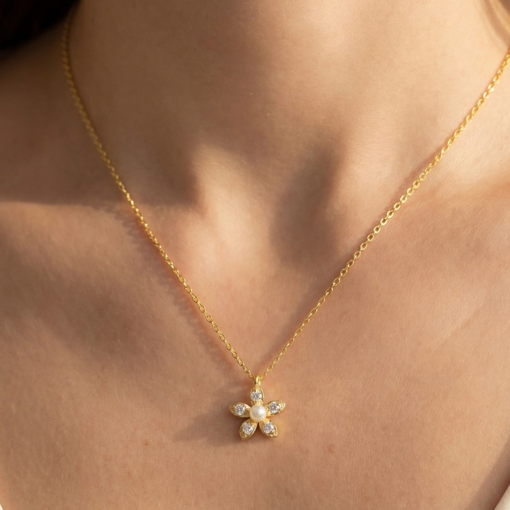Gold Dipped Pearl Stud Flower Pendant Necklace