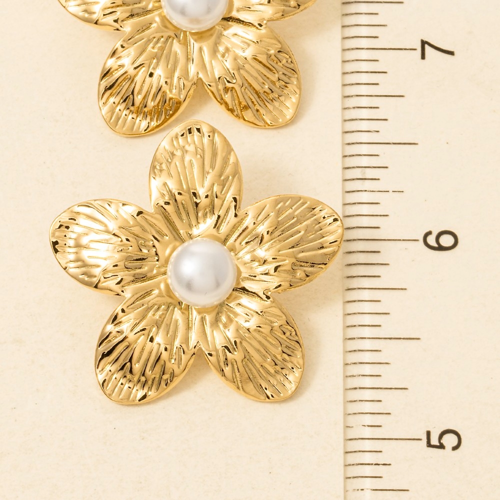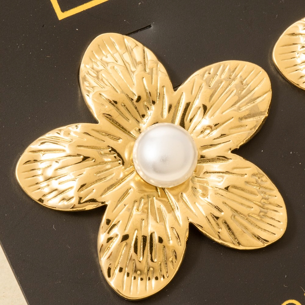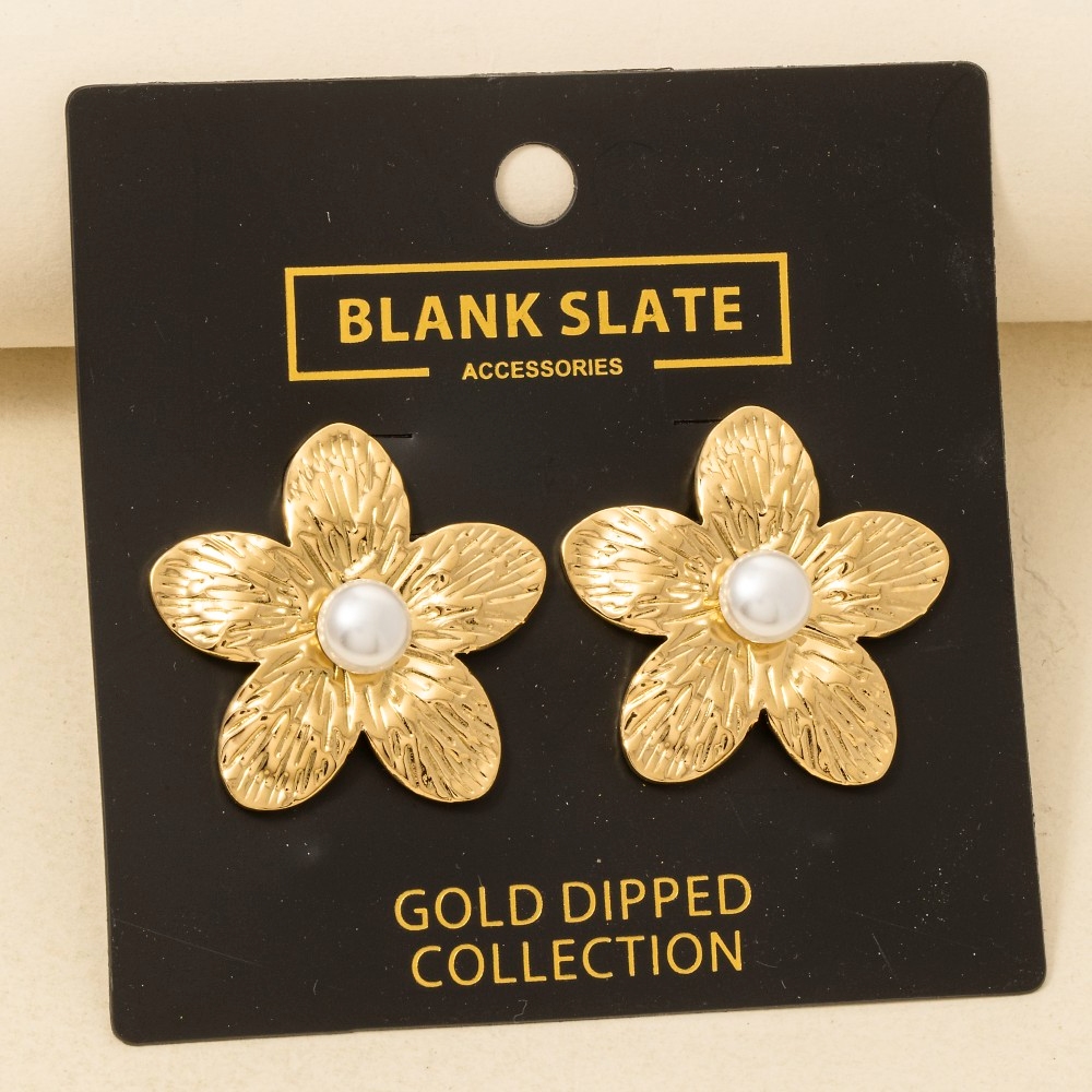 Effortlessly stylish and always on-trend, this pair of stud earrings embodies a sophisticated gold dipped pearl stud 5 petal flower large design. Unlock endless styling possibilities with this versatile pair of stud earrings, creating a signature look that speaks volumes. Available in GOLD. This item is sold in packs of 1.
