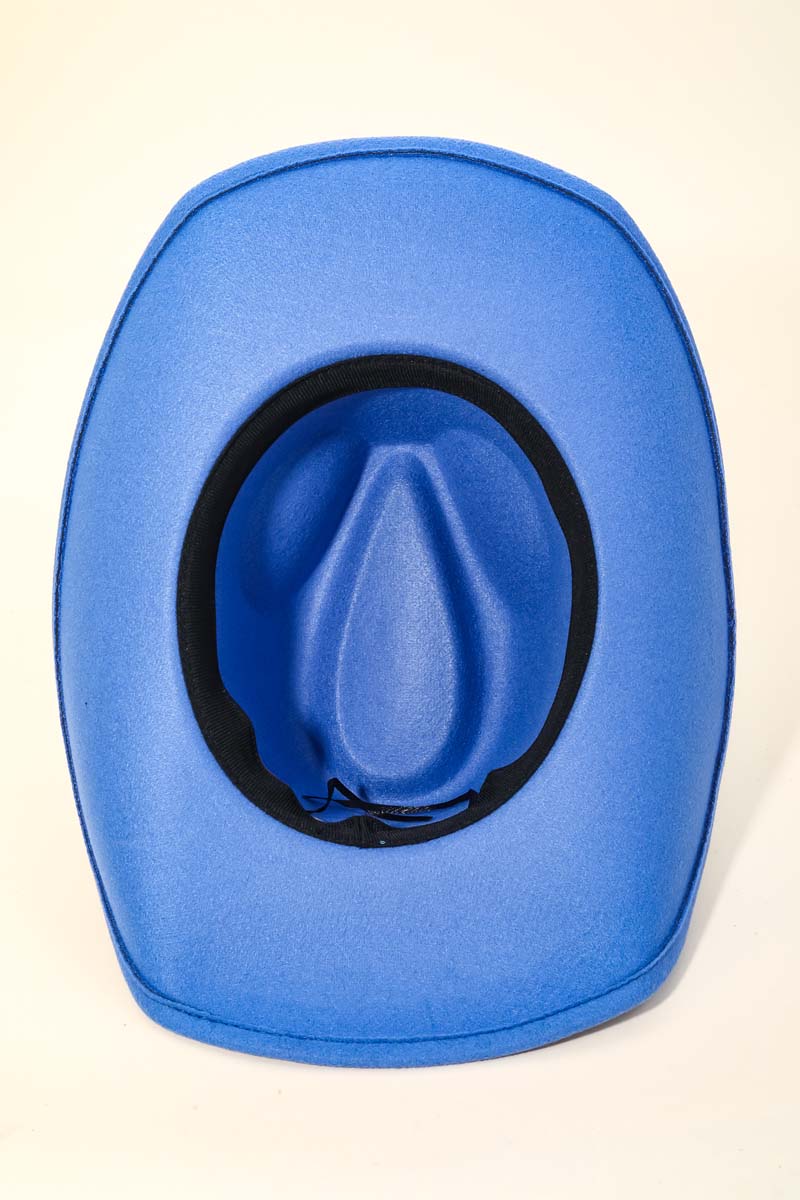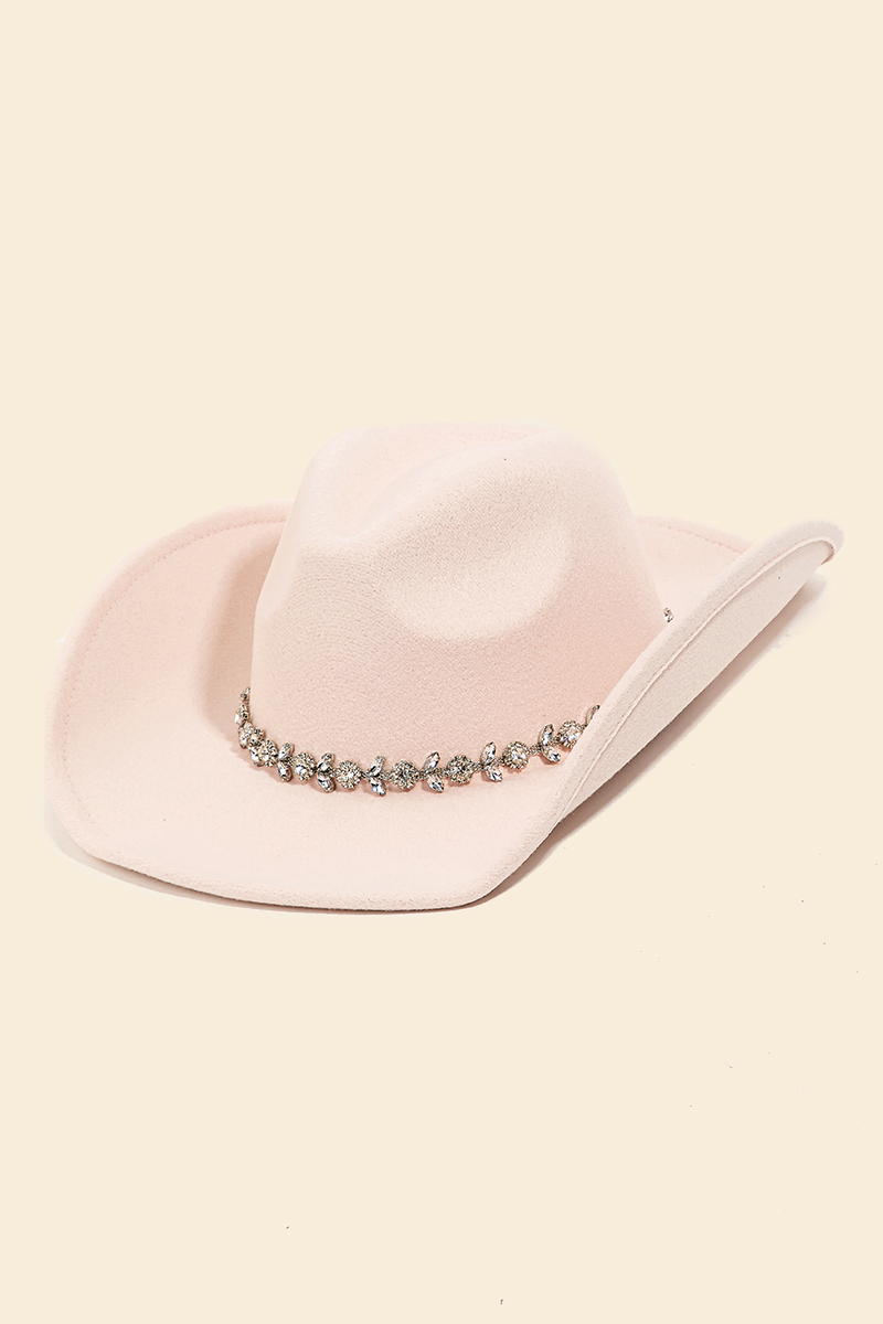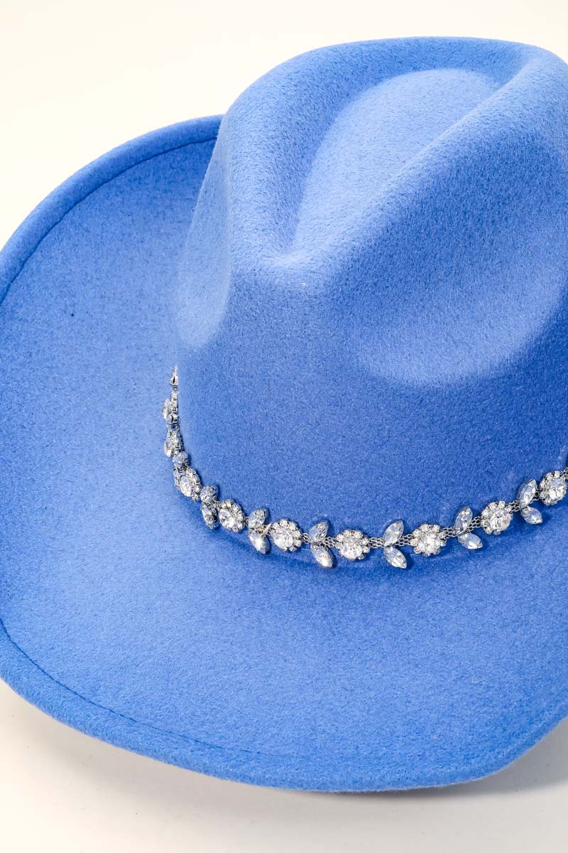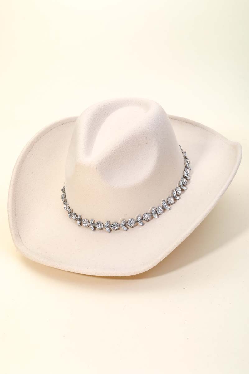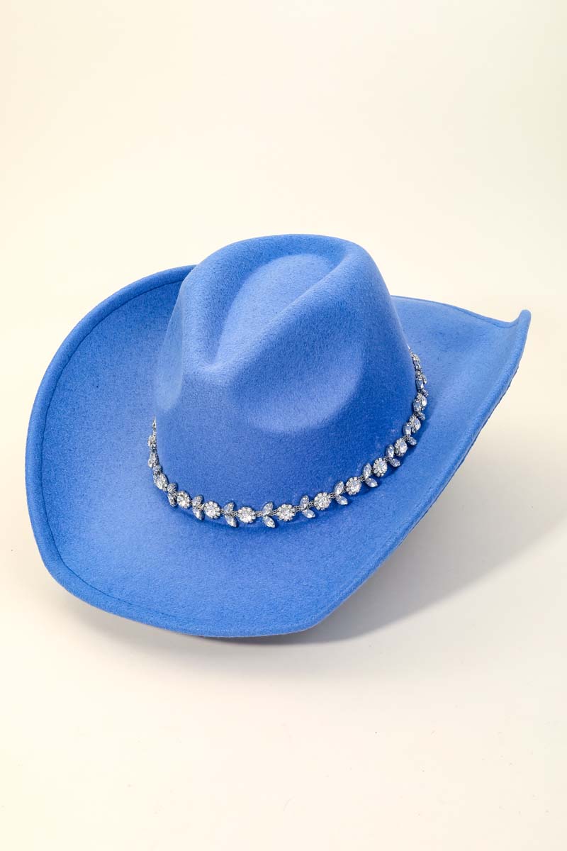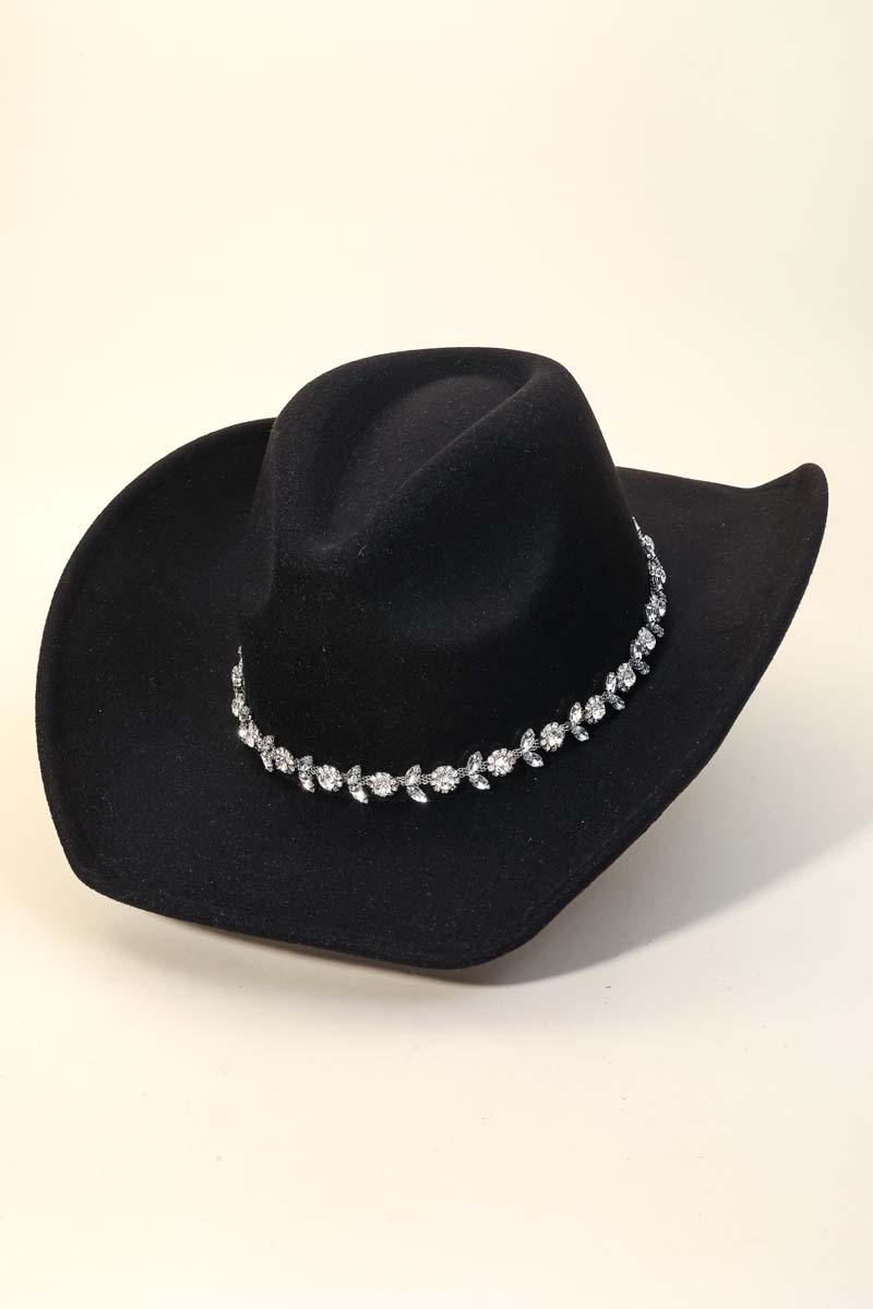 This is the perfect cowboy hat for any occasion cowboy hat displays a unique flower rhinestone chain strap design. A must-have cowboy hat that adds a unique flair to any look. Available in BK, IV, BL, FU, NU and RU. This item is sold in packs of 1.
