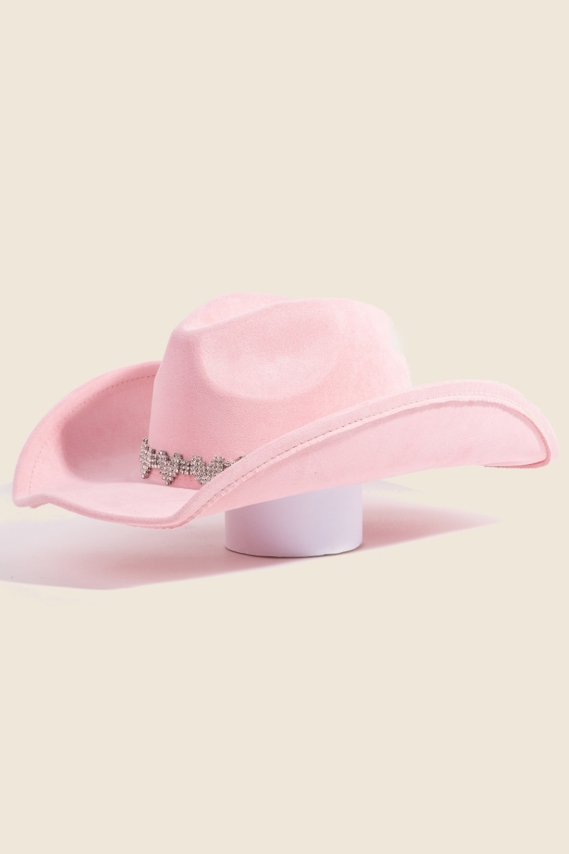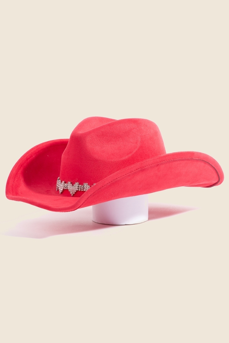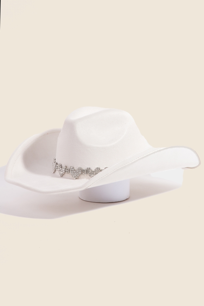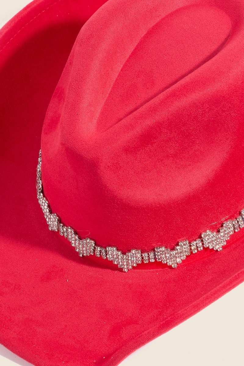 • The perfect way to add some sparkle to your outfit, this cowboy hat flaunts a luxurious rhinestone heart band design. Add a dash of sophistication to your look with this versatile cowboy hat, a must-have for fashion enthusiasts. Available in BK, IV, PK, RD. This item is sold in packs of 1.