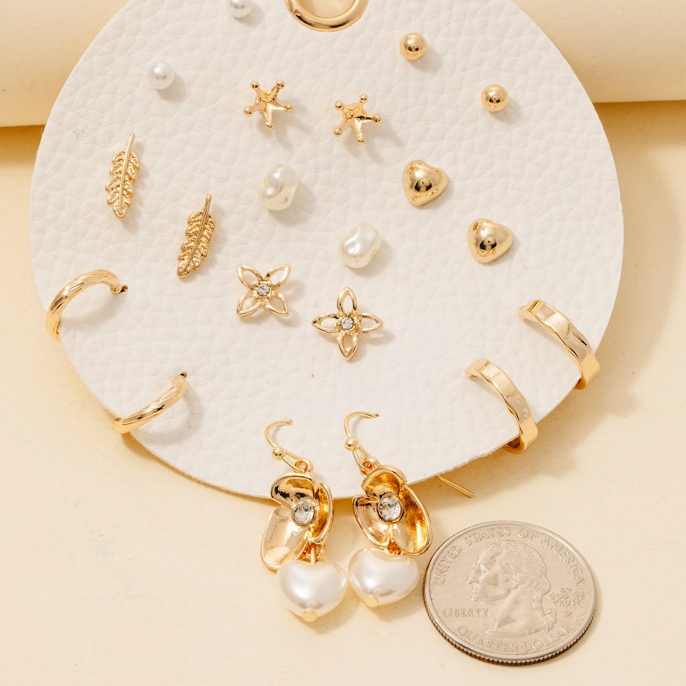 A bold and daring choice, perfect for those who want to stand out from the crowd, this pair of stud earrings features a distinct heart floral and pearl 10 pair set design. Elevate your fashion statement with this versatile pair of stud earrings, adding a touch of glamour to your everyday look. Available in GDCRM. This item is sold in packs of 1.