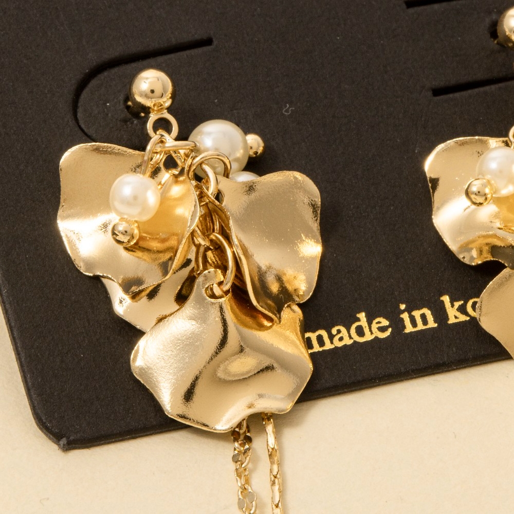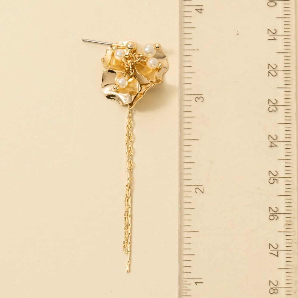 • Bold and daring, this pair of dangle earrings introduces an exceptional metallic flower petals and chain design. This item is ideal for those who want to add some personality to their outfits without being too bold. Available in G. This item is sold in packs of 1.