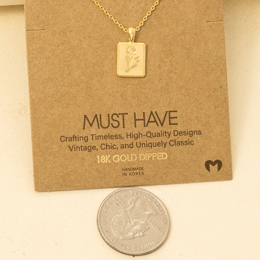 Perfect for any fashion-forward individual, this trending necklace flaunts a luxurious flower print square pendant necklace design. Take your style to the next level by incorporating this versatile trending necklace, a key element in achieving a polished look. Available in G, S and R. This item is sold in packs of 1.