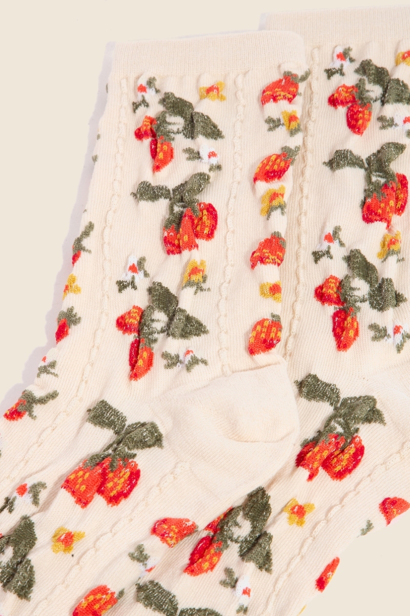 • This pair of socks features a fashionable strawberries and flowers embroidered beige style. Delight in the nuanced details that make this pair of socks a testament to fine design and impeccable taste.