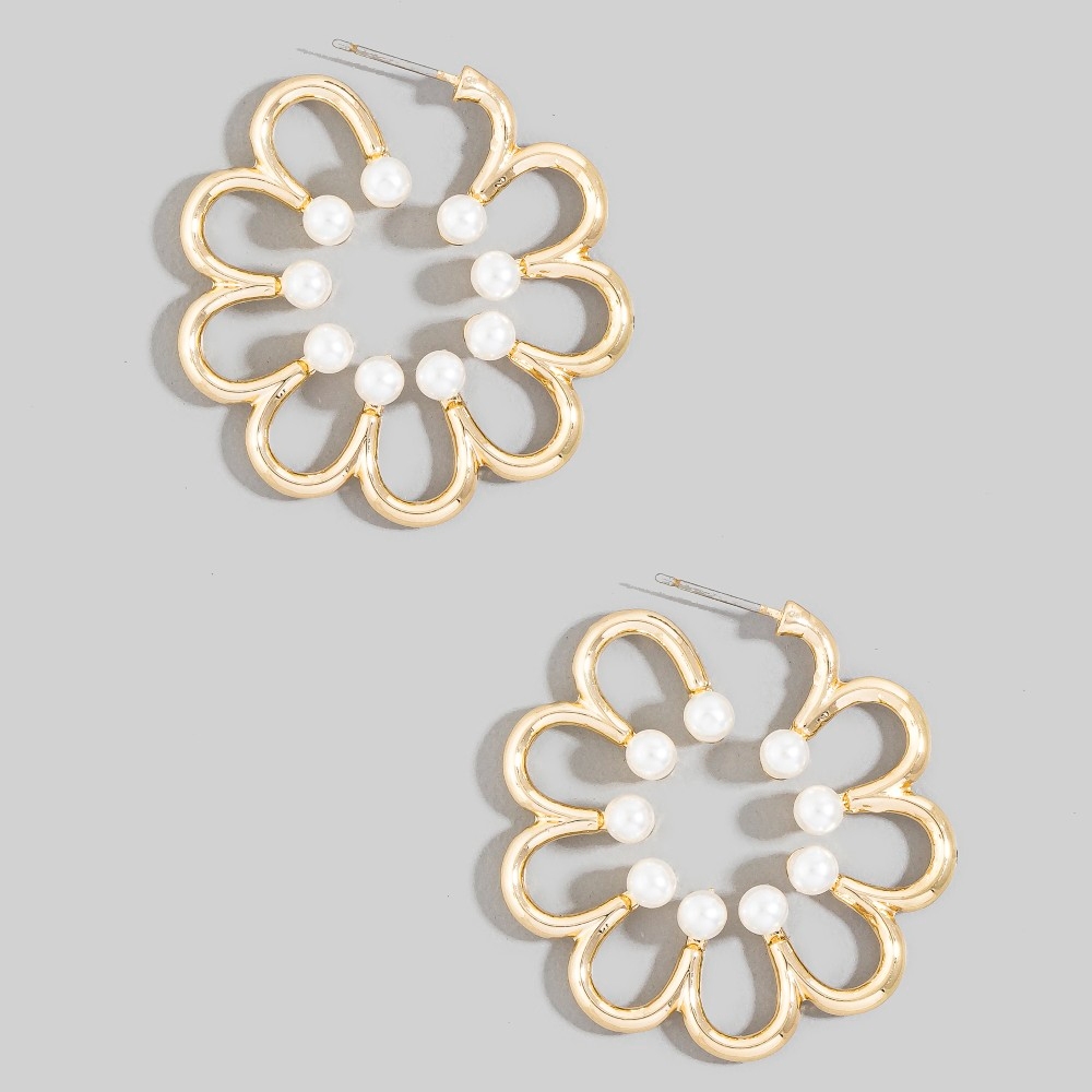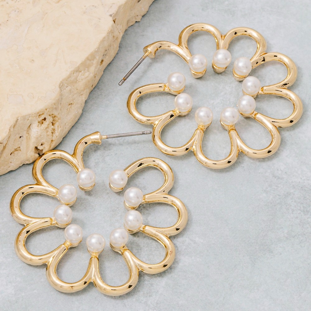 • The perfect way to add some sparkle to your outfit, this pair of hoop earrings incorporates a remarkable pearl studded wavy flower design. The perfect pair of hoop earrings for completing any outfit, whether you're dressing up or keeping it casual. Available in PLG. This item is sold in packs of 1.