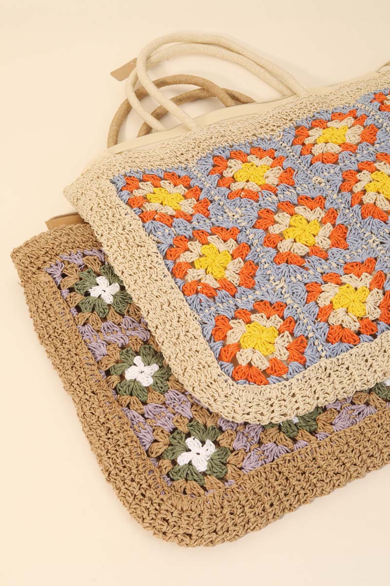 Perfect for any fashion-forward individual, this tote bag possesses a fine straw braided floral pattern design. Unlock endless styling possibilities with this versatile tote bag, creating a signature look that speaks volumes. Available in IV and KA. This item is sold in packs of 1.