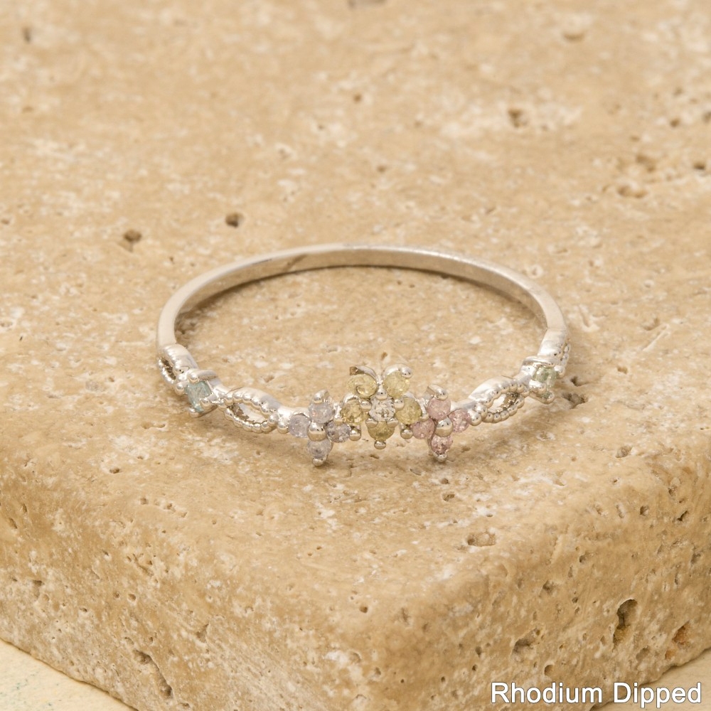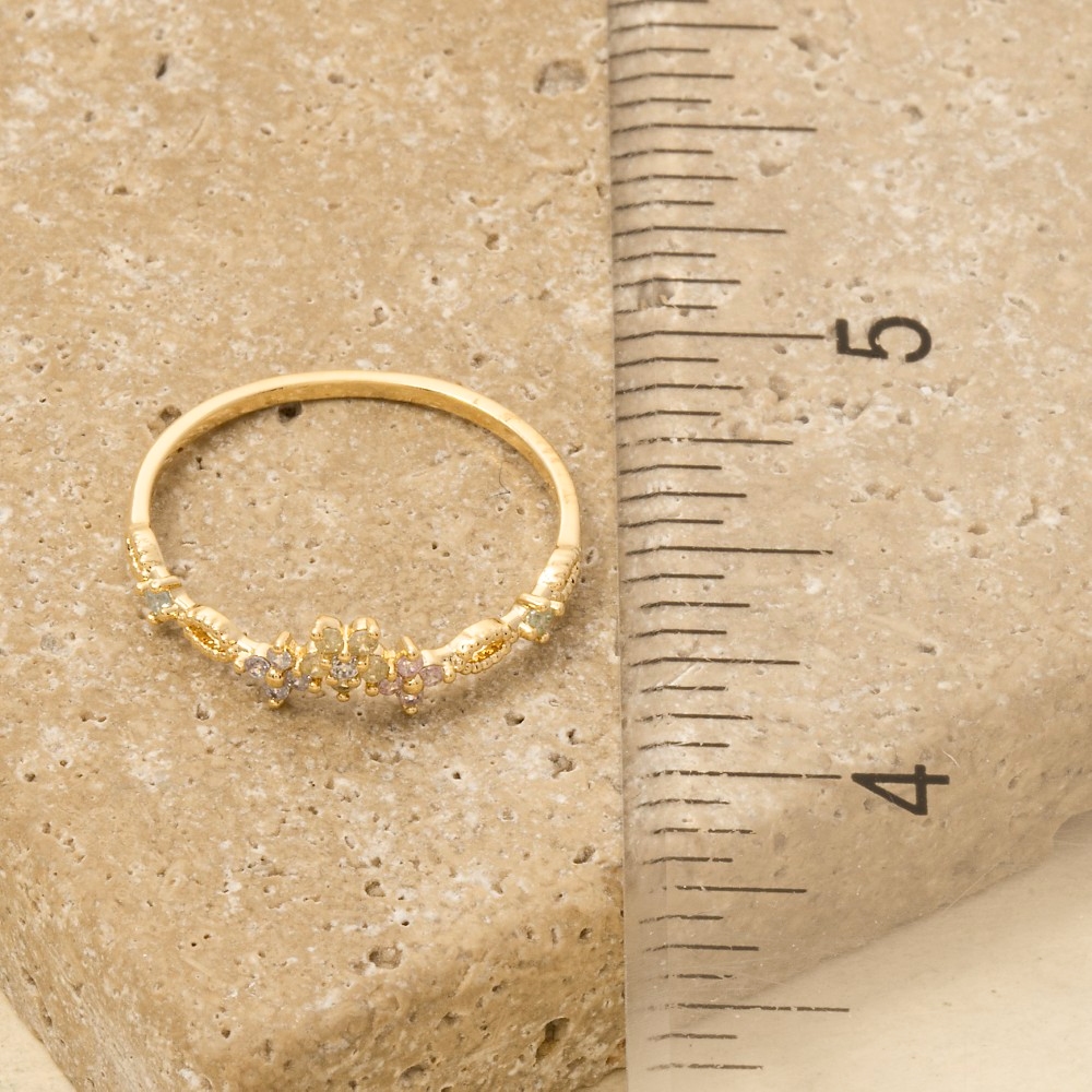 A contemporary masterpiece, this ring incorporates a remarkable gold dipped colorful cubic zirconia flower design. Perfect for adding a touch of glamour and sophistication to any outfit, this ring is a must-have. Available in G, S. This item is sold in packs of 1.