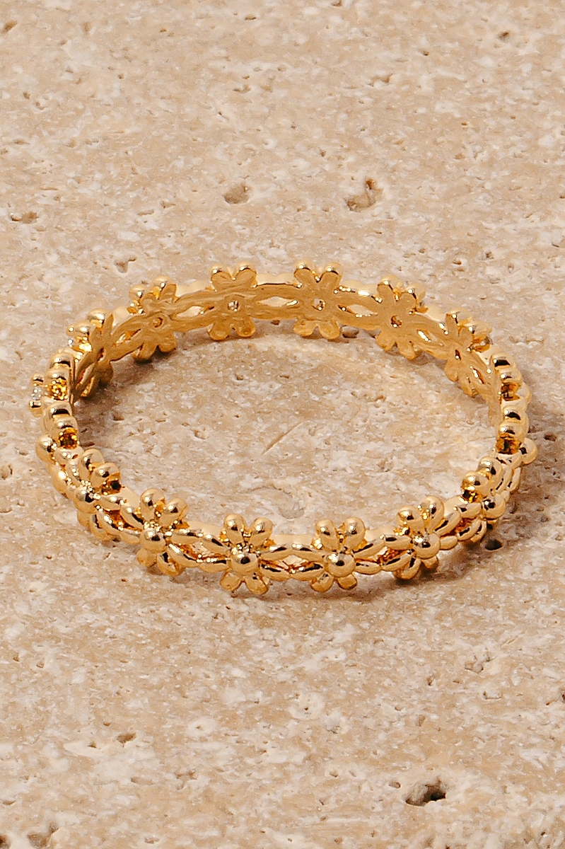• This ring brings a unique metallic mini flowers station band style. Unveil a new dimension of sophistication as this ring effortlessly enhances the elegance of your ensemble.