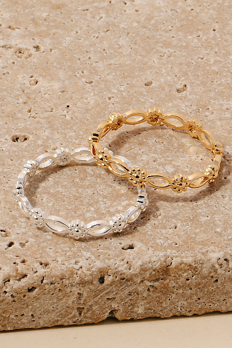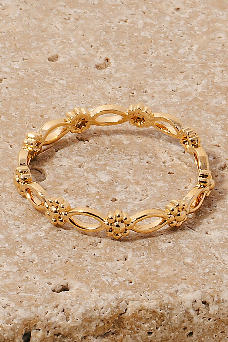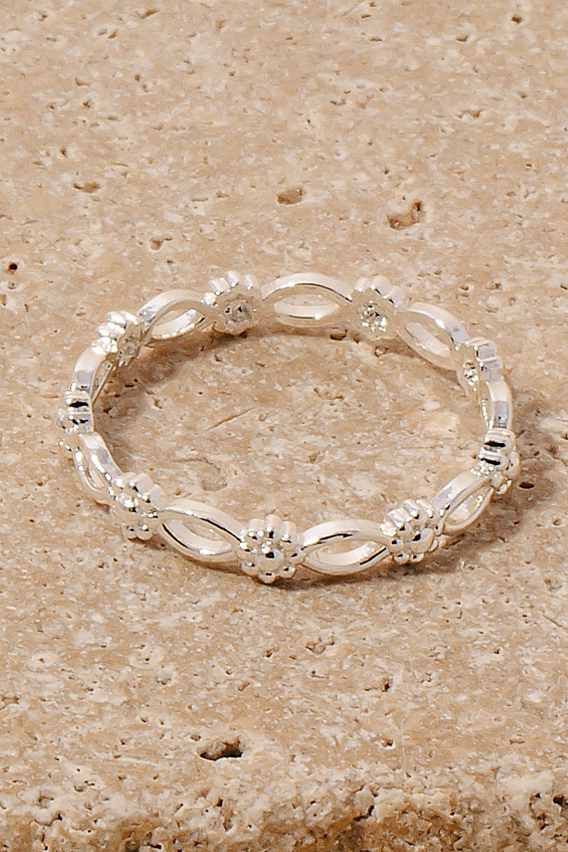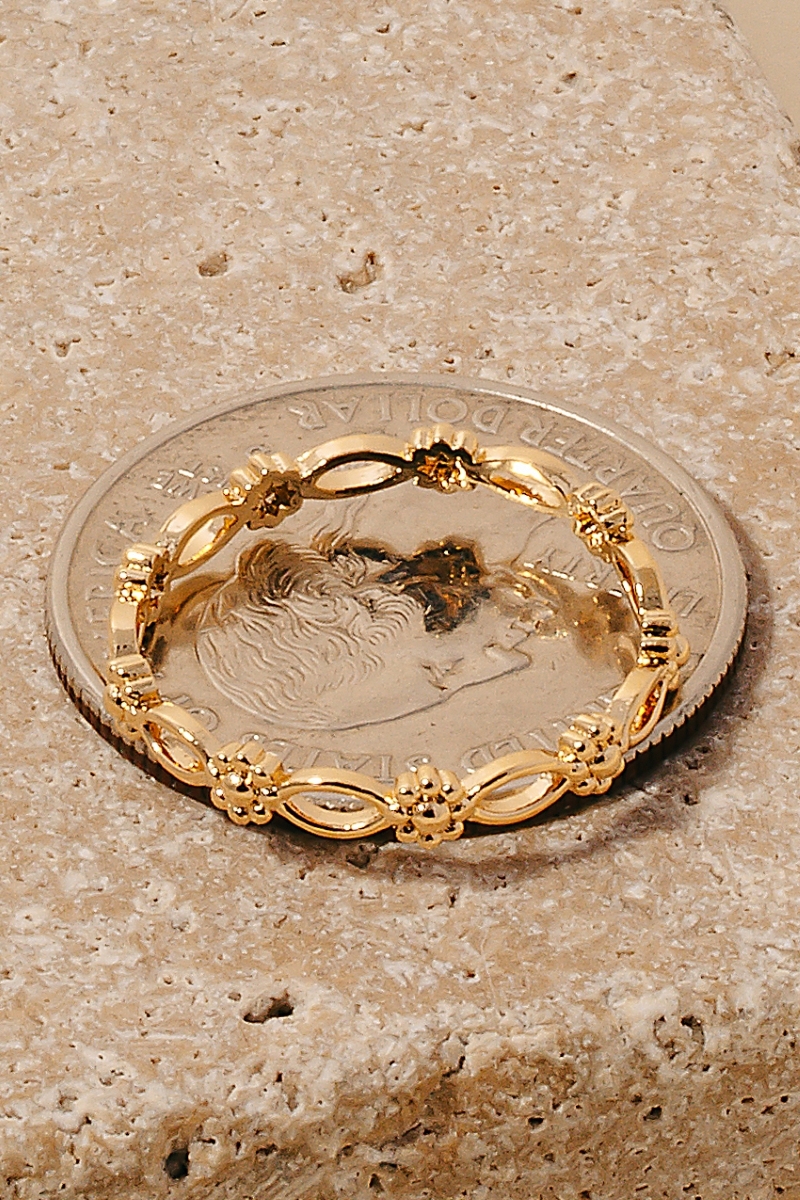 • This ring introduces a unique metallic oval and flower station band style. Step into a world of refined taste as this ring effortlessly refines the details of your outfit.