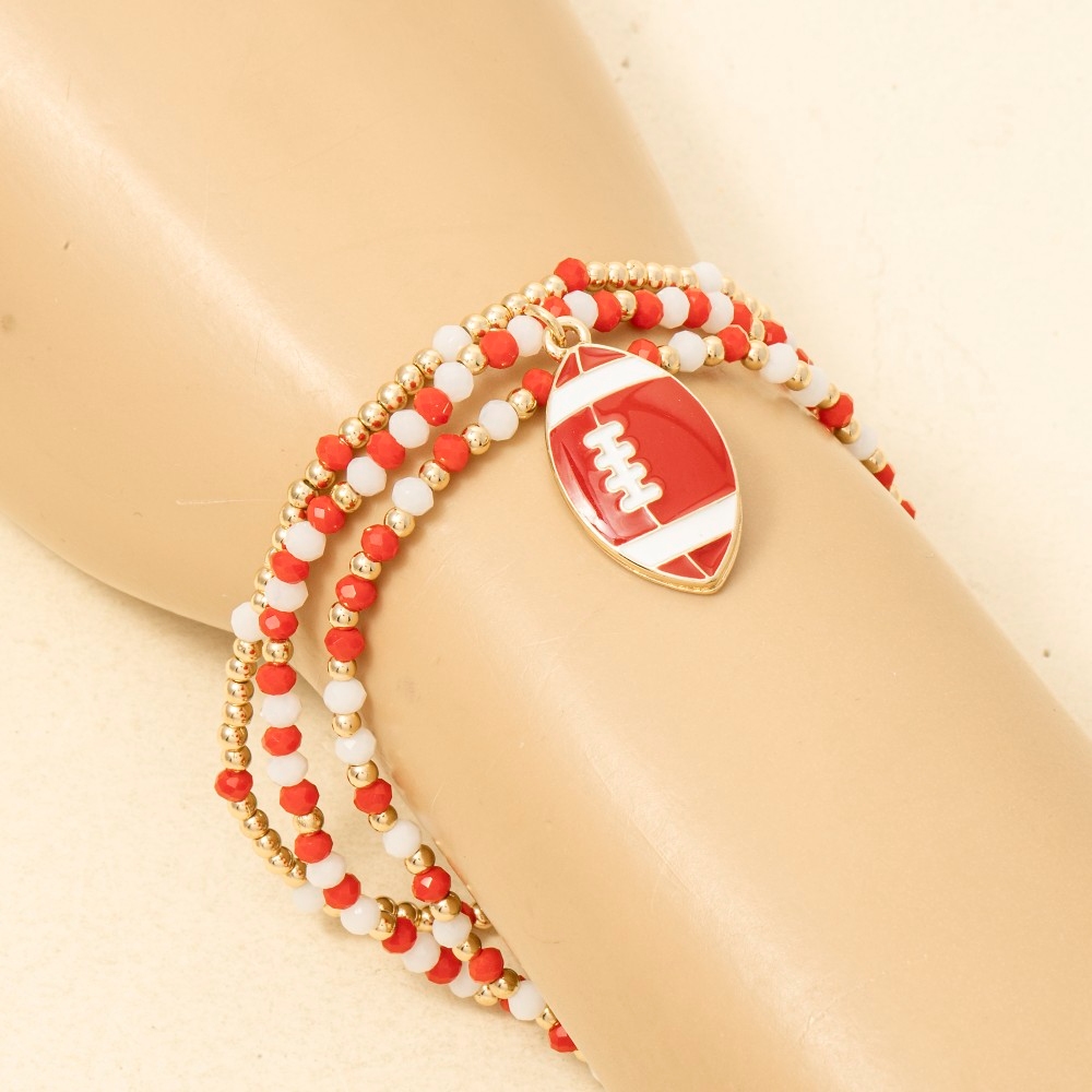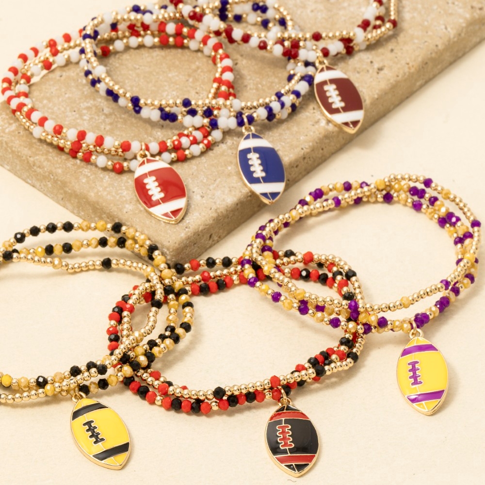 • Bold and daring, this bracelet embodies a sophisticated game day colors enamel football beaded design. This bracelet is ideal for both casual and formal events, adding a touch of sophistication to any outfit. Available in BKRD, BUWH, MUBK, MUPU, RDWH, SAWH. This item is sold in packs of 1.