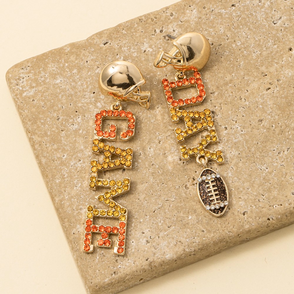Perfectly polished and endlessly versatile, this pair of dangle earrings shows off a distinctive football theme pave game day design. Perfect for dressing up your favorite outfit, this pair of dangle earrings is a must-have. Available in BRG. This item is sold in packs of 1.