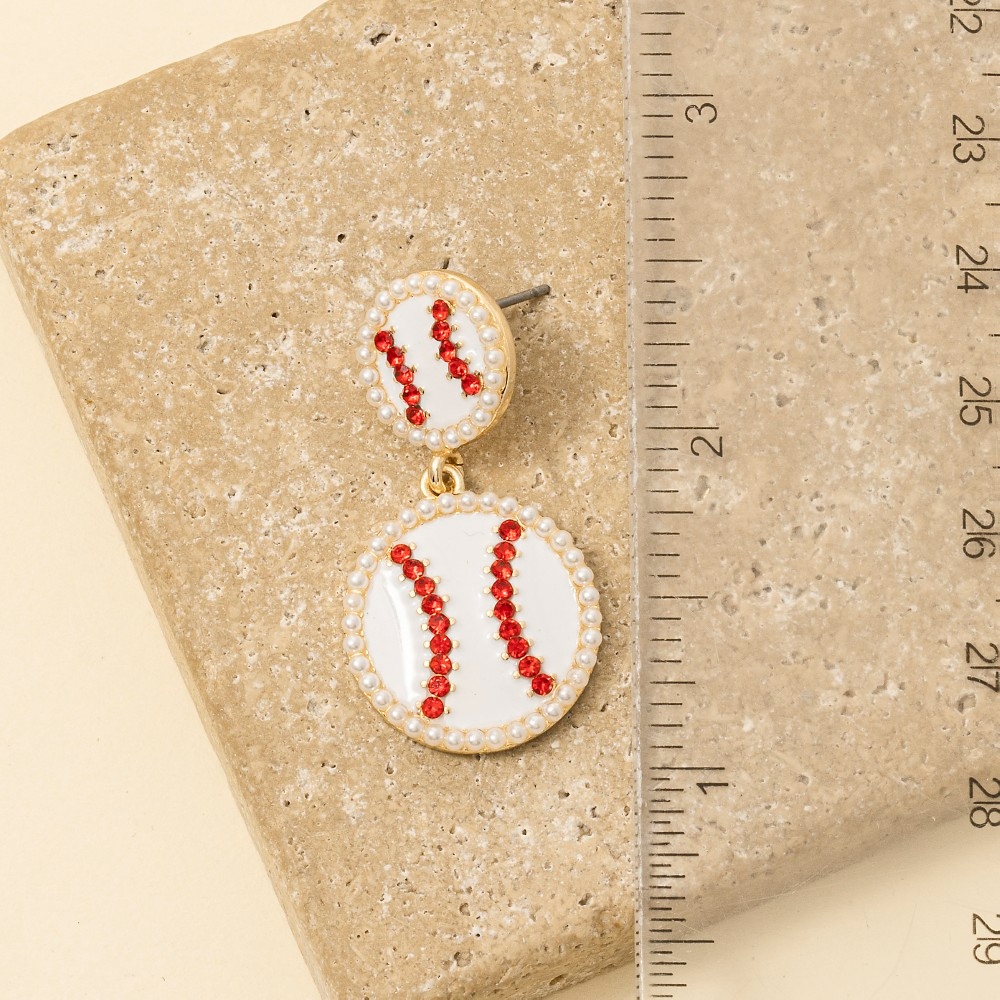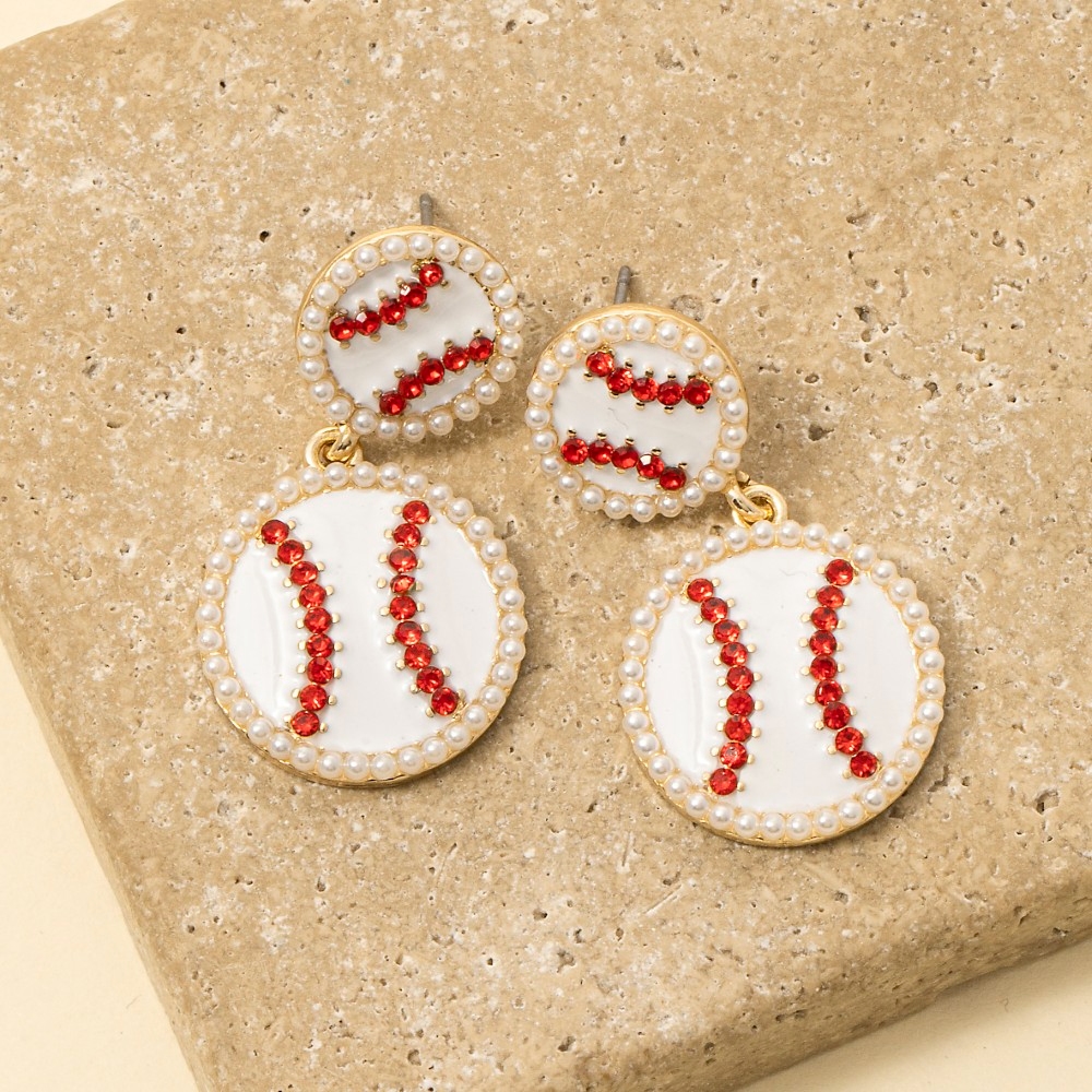 - The perfect way to elevate any outfit, this pair of dangle earrings showcases a breathtaking pave enamel baseballs design. Infuse a hint of luxury into your daily attire with this versatile pair of dangle earrings, a must-have for those who appreciate timeless elegance. Available in WHG. This item is sold in packs of 1.