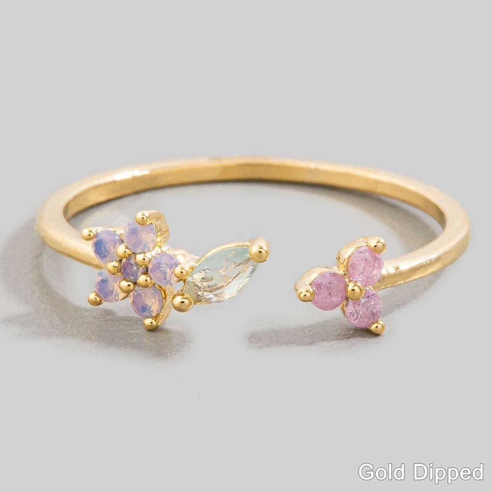 - Effortlessly chic and sophisticated, this ring comes with a special gold dipped cubic zirconia cluster open band design. Elevate your fashion ensemble effortlessly with this versatile ring, a stylish choice for the modern trendsetter. Available in G. This item is sold in packs of 1.