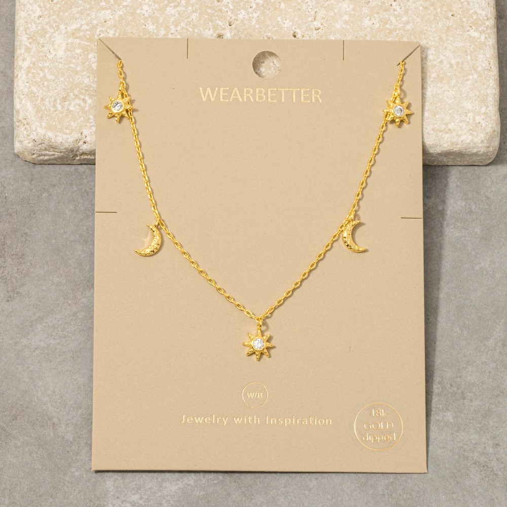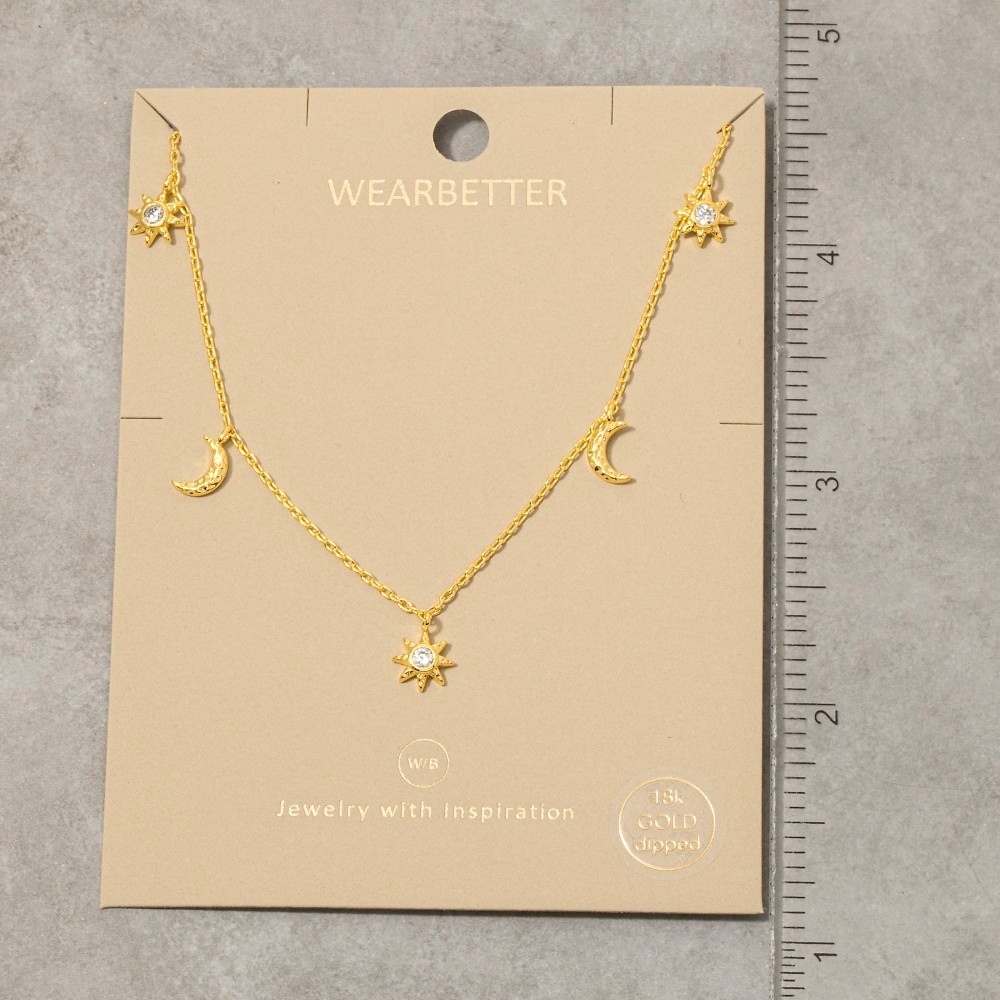 • Stay on-trend and ahead of the fashion curve, this necklace radiates a sleek gold dipped cubic zirconia pave stars moon station charms design. This item adds the perfect finishing touch to any outfit, making it stand out from the crowd. Available in G, S. This item is sold in packs of 1.
