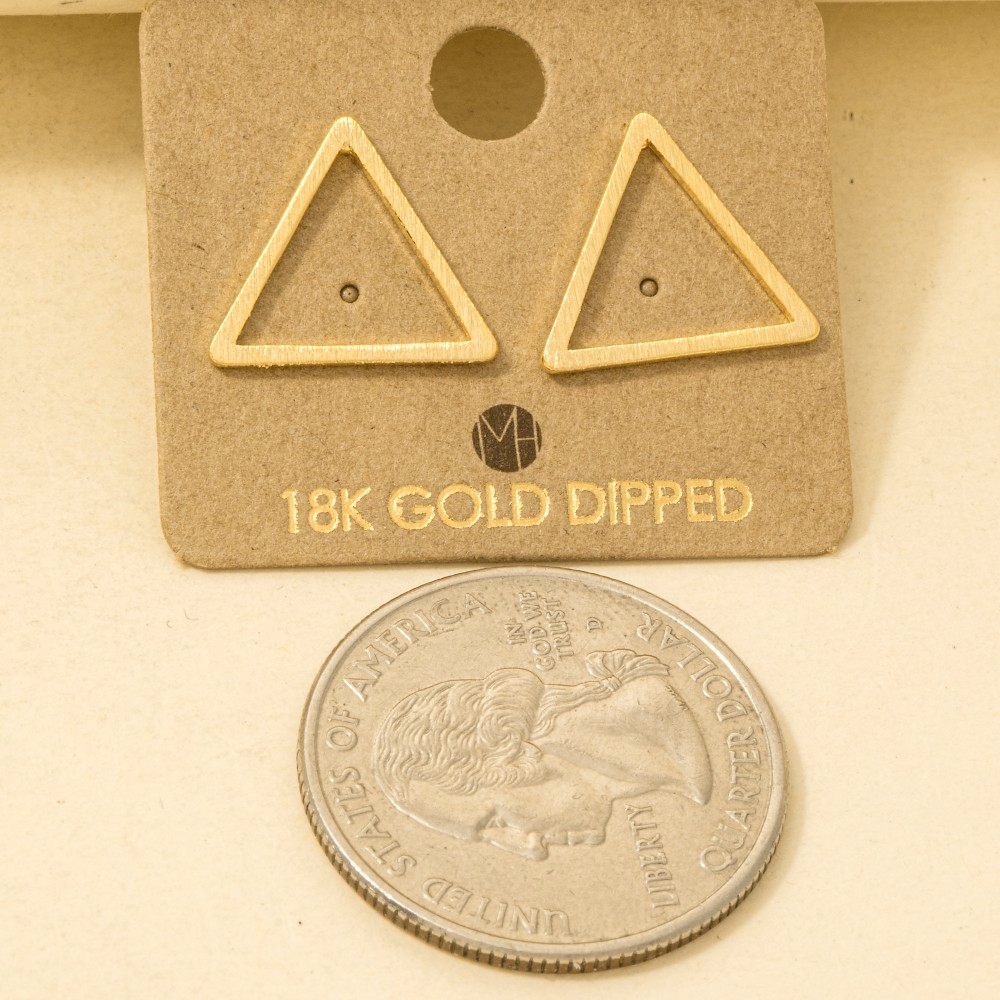 • A unique and stylish piece that sets you apart, this trending pair of earrings incorporates a flawless gold dipped triangle cut out stud earrings design. Redefine your wardrobe with this versatile trending pair of earrings, a timeless addition that brings an air of sophistication to any look. Available in G, S and R. This item is sold in packs of 1.