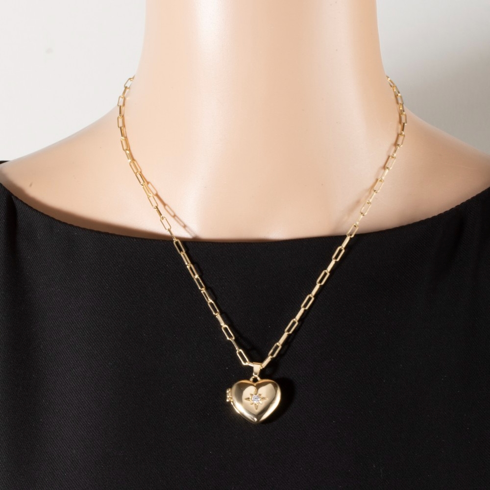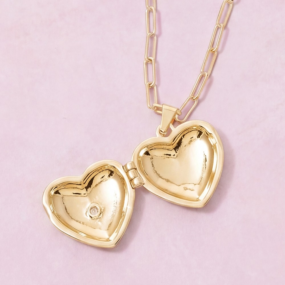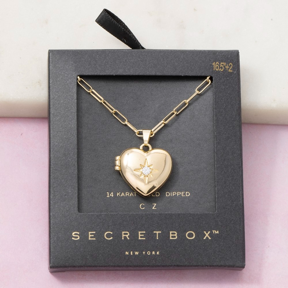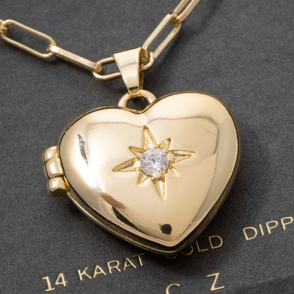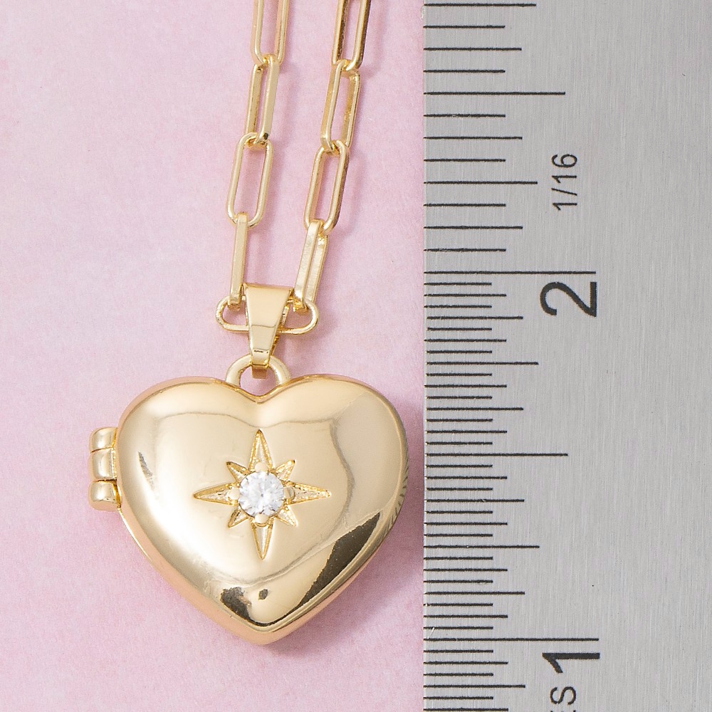 Add a touch of luxury to any outfit, this necklace exudes a refined 14k gold dipped cubic zirconia heart locket design. Perfect for any occasion, this versatile necklace will enhance any outfit you wear. Available in GD, WG. This item is sold in packs of 1.