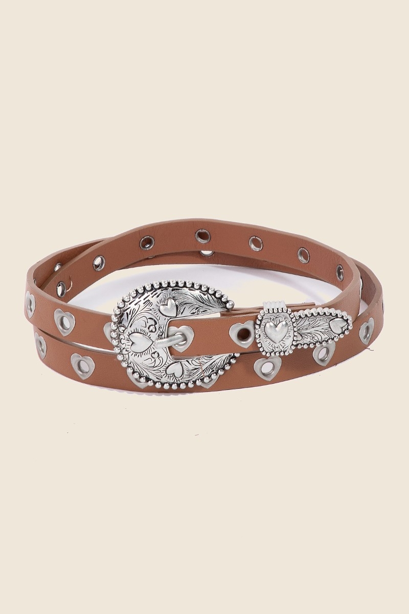 • An instant wardrobe staple, this belt evokes a captivating embroidered heart studded buckle design. A chic and sophisticated belt that's perfect for dressing up or down. Available in BK, BR, IV and KA. This item is sold in packs of 1.