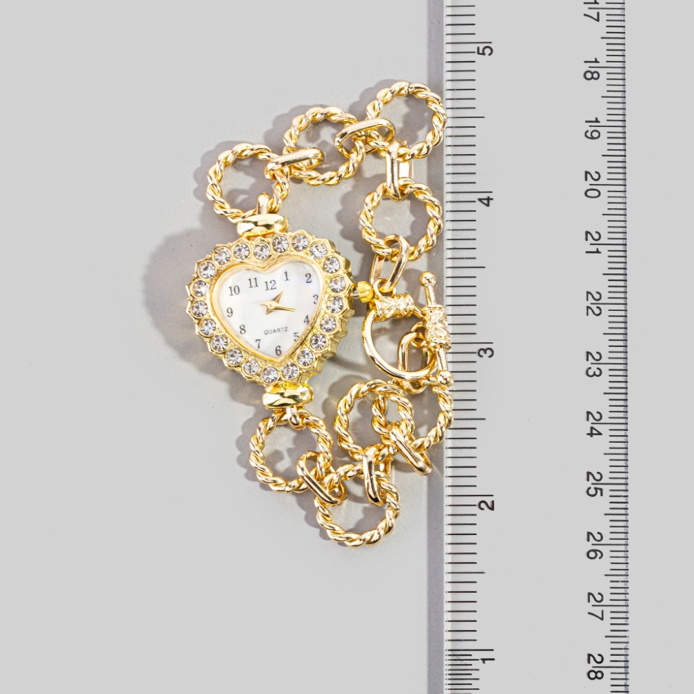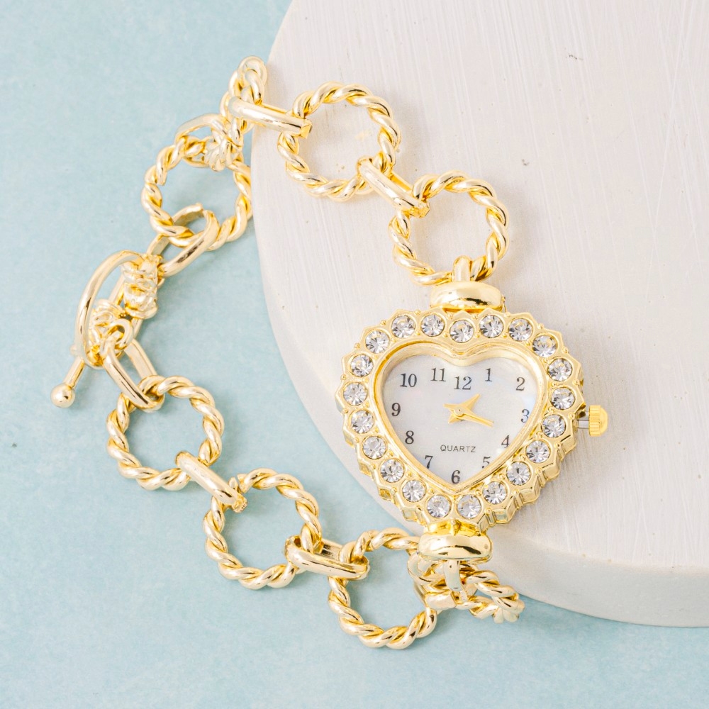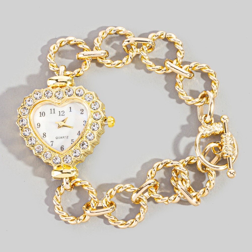 • A classic design with a modern twist, this chain bracelet adds a distinctive cz studded heart toggle watch design. Elevate your fashion statement with this versatile chain bracelet, adding a touch of glamour to your everyday look. This item is sold in packs of 1.