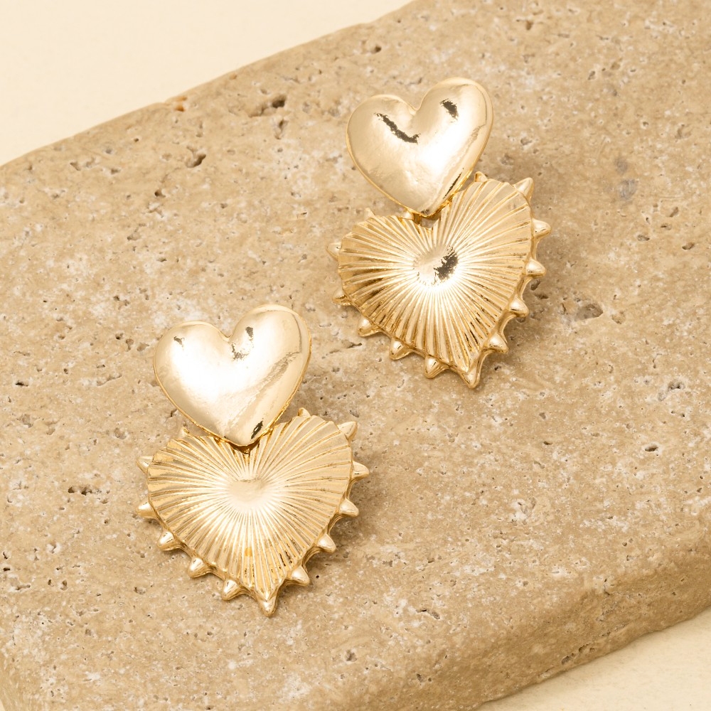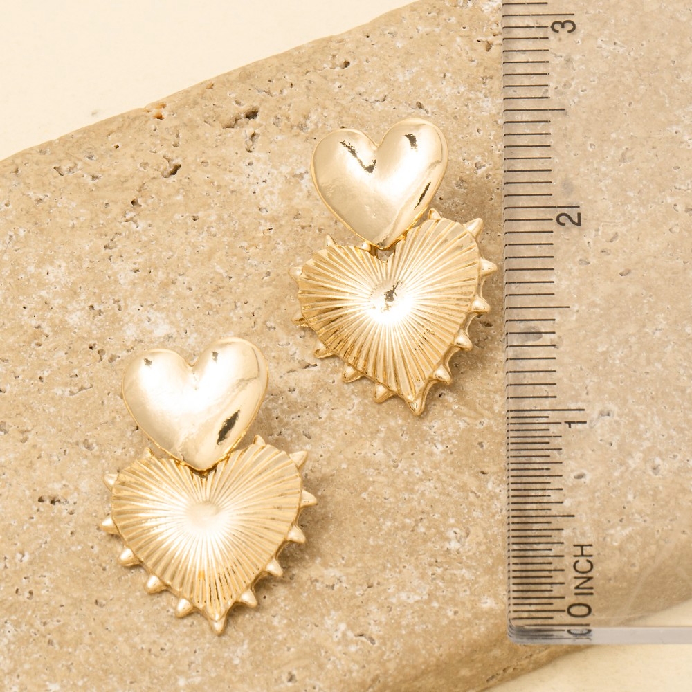 • This is the perfect pair of dangle earrings for any occasion pair of dangle earrings displays a unique double metallic heart stud design. This pair of dangle earrings is an effortless way to add some personality to your outfit. Available in G. This item is sold in packs of 1.