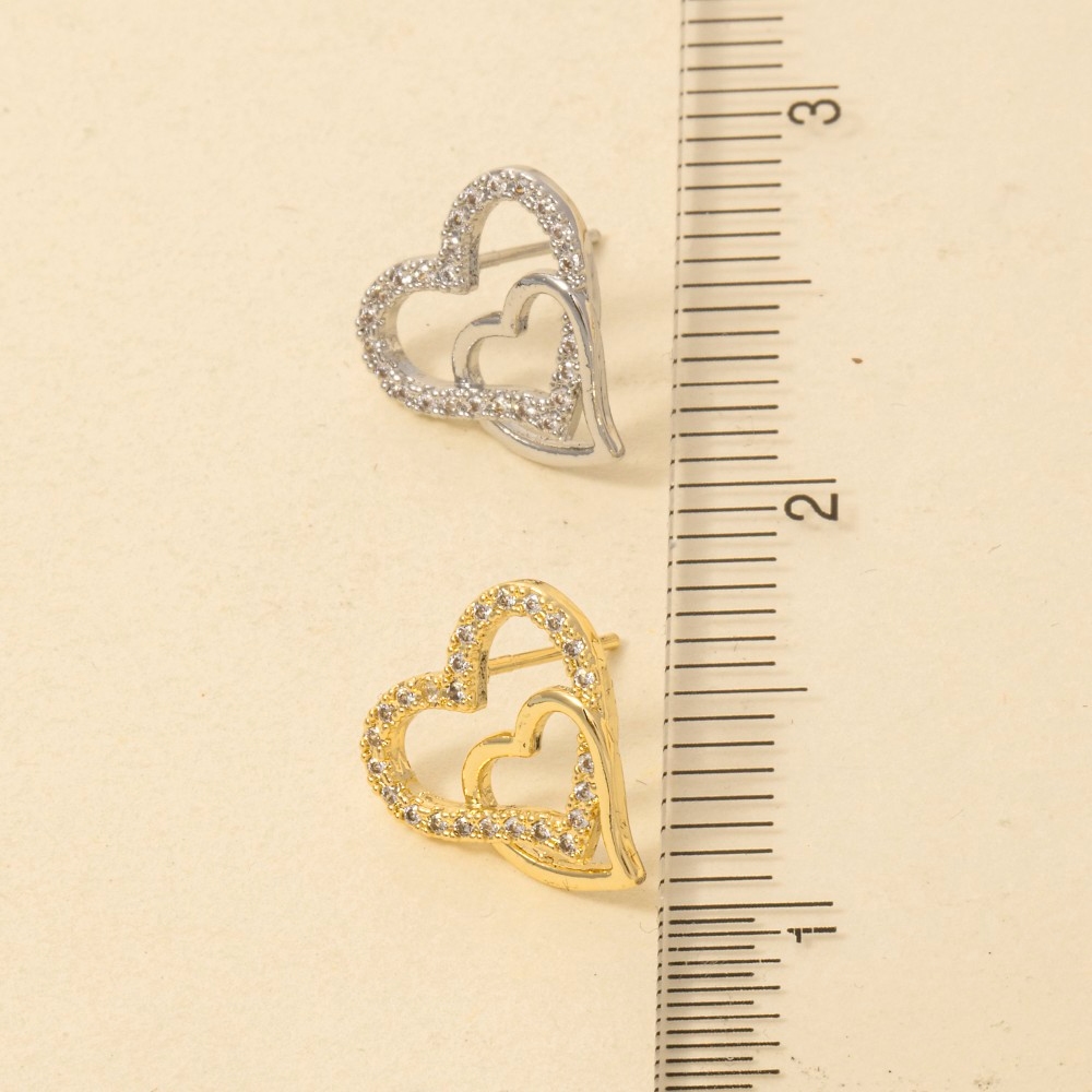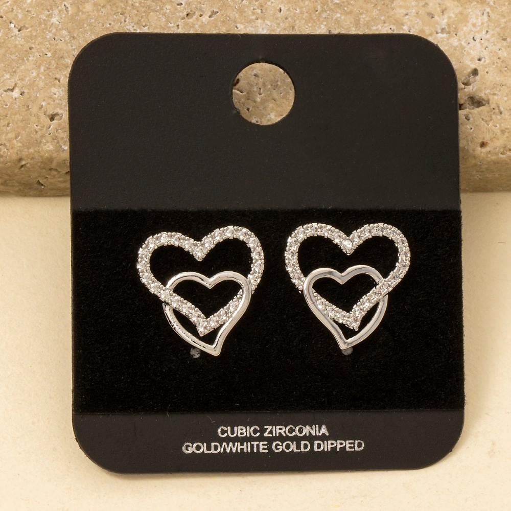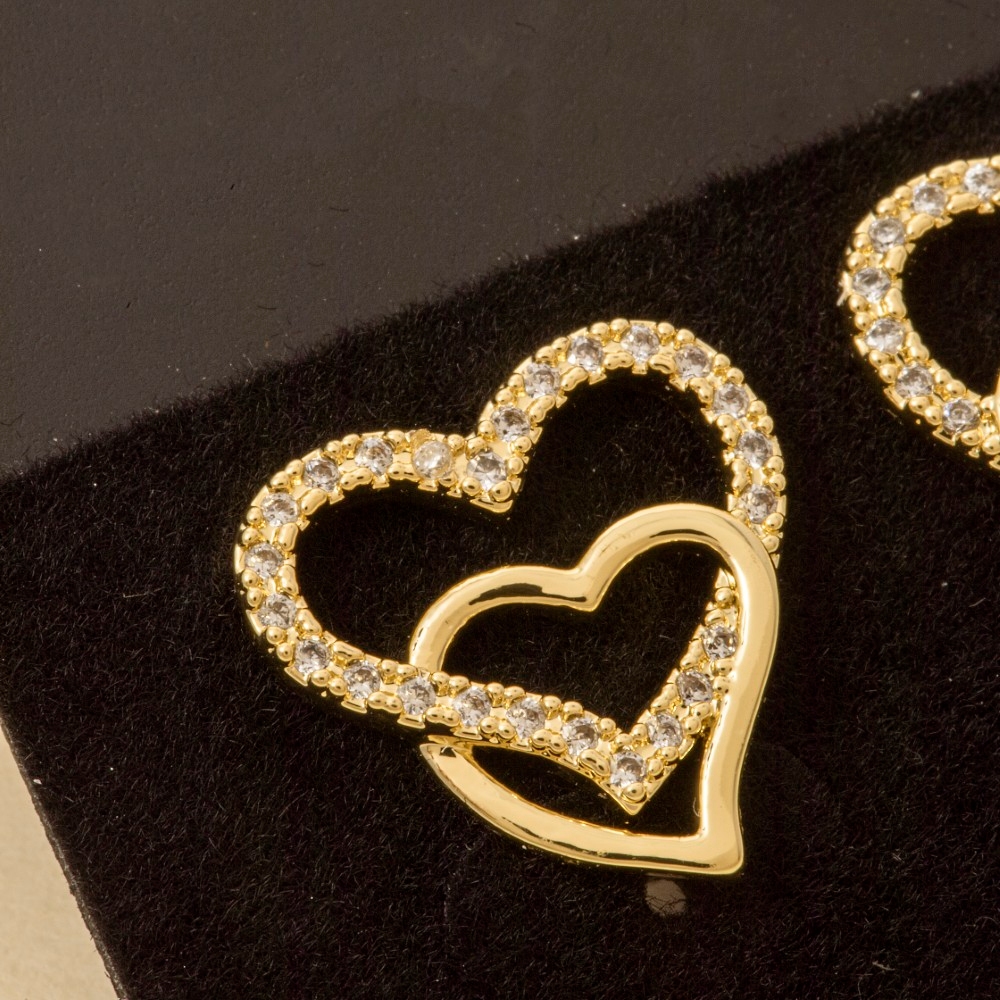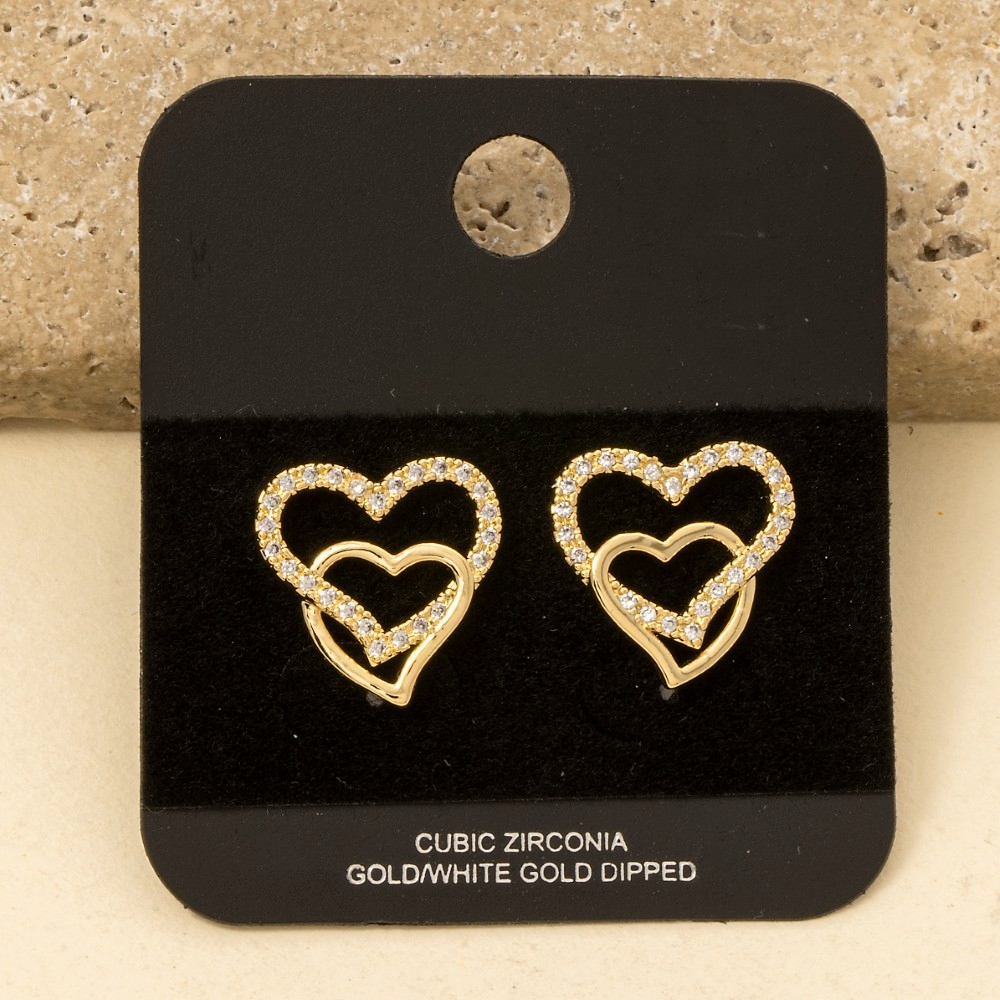 Effortlessly elevate your outfit, this pair of stud earrings offers a remarkable gold dipped cubic zirconia pave layered hearts design. Perfect for dressing up or down, this versatile pair of stud earrings adds a touch of sophistication to any look. Available in G, S. This item is sold in packs of 1.