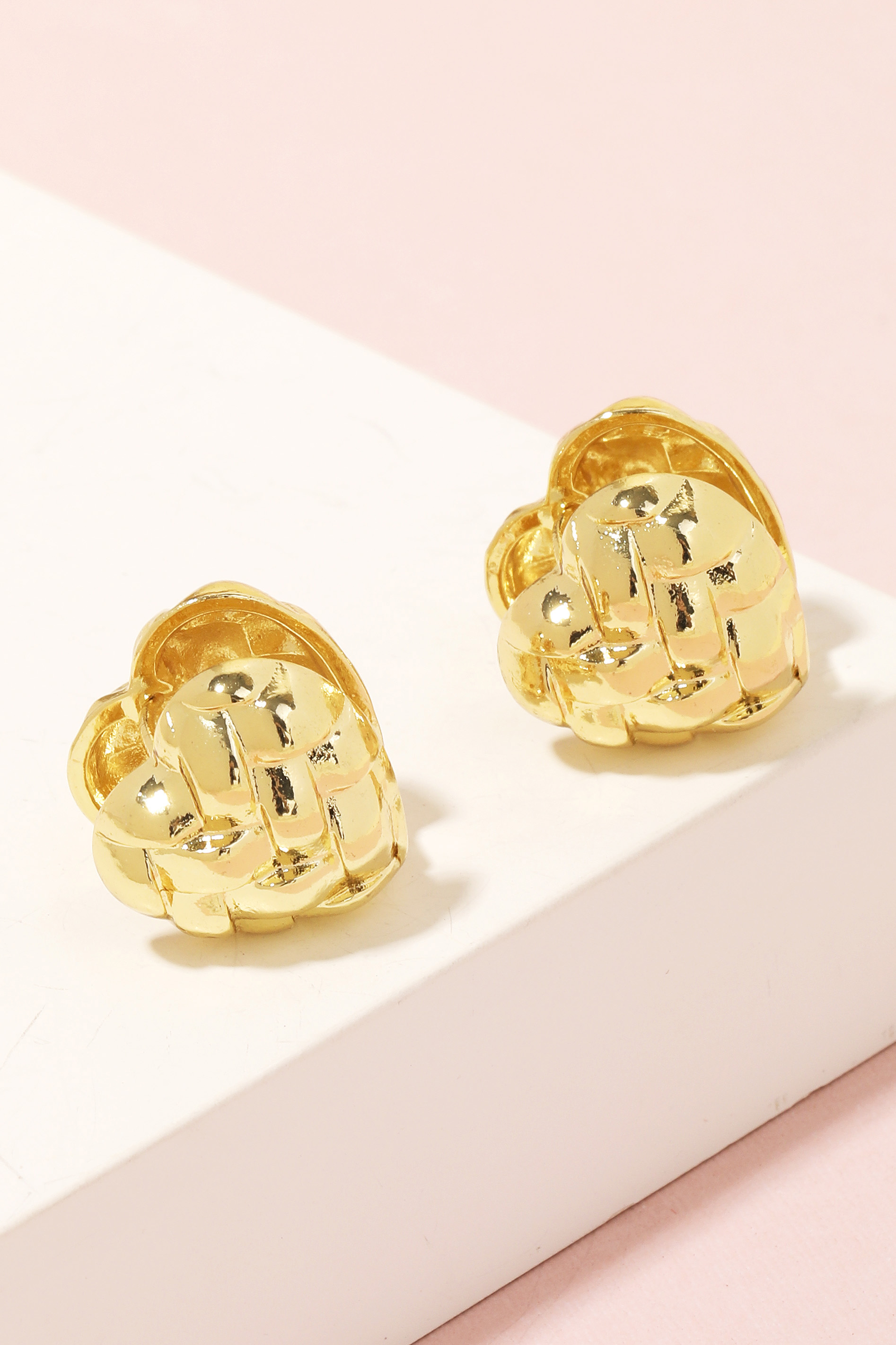 • A stunning piece that is sure to turn heads, this pair of stud earrings includes a stunning metallic braided heart latch design. The perfect way to elevate any outfit, this pair of stud earrings adds a touch of elegance and style. Available in G. This item is sold in packs of 1.