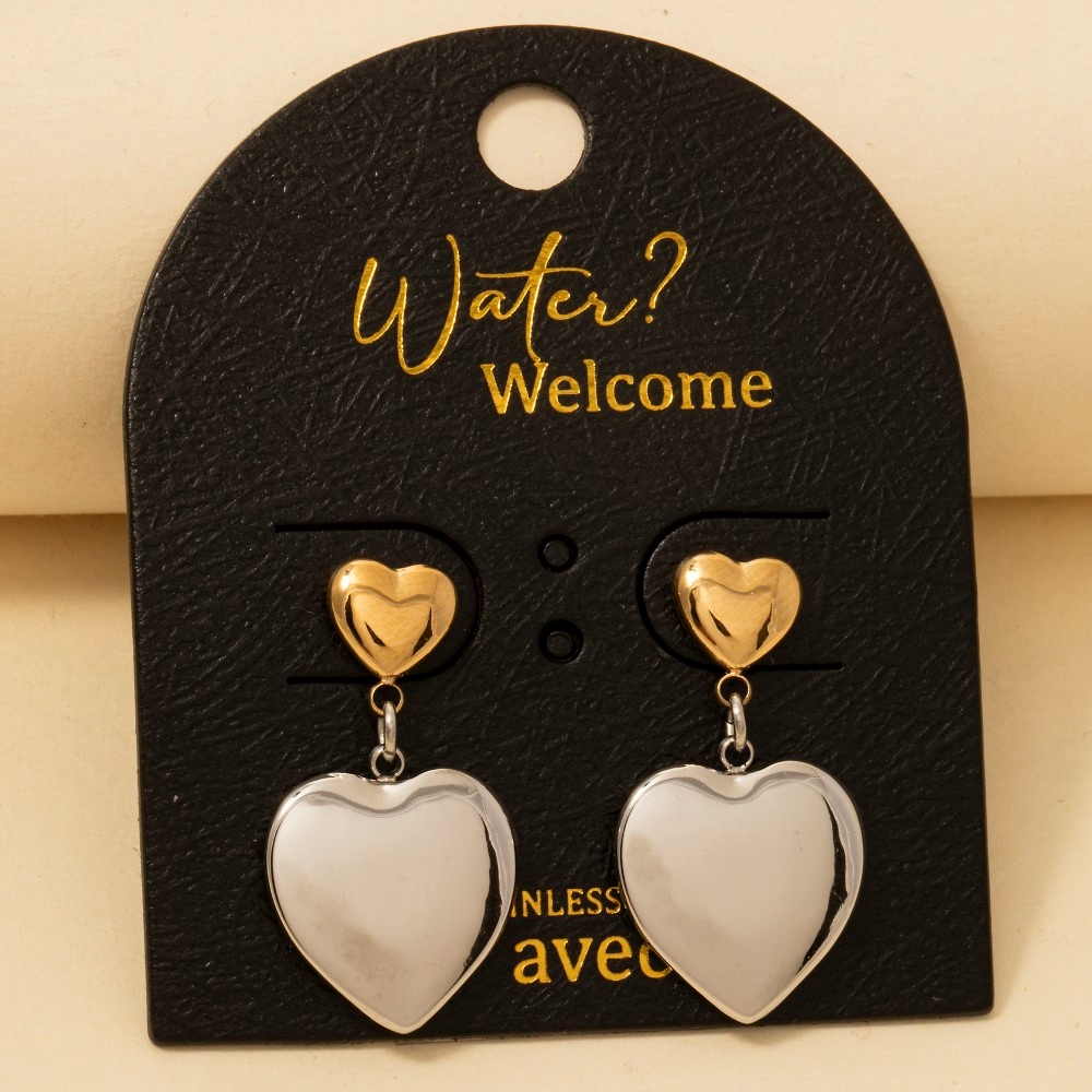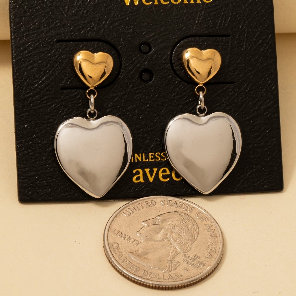 - A bold and daring choice that is sure to impress, this pair of dangle earrings adds a distinctive two tone stainless steel heart design. A stylish pair of dangle earrings that's perfect for complementing your favorite outfit. Available in GDMRH. This item is sold in packs of 1.