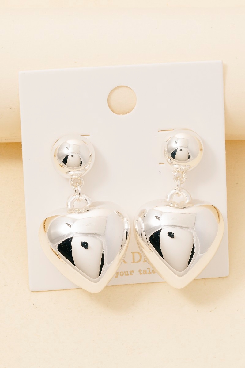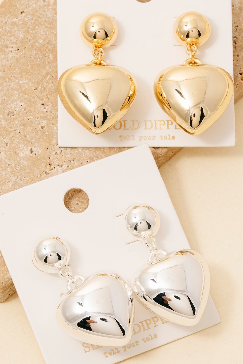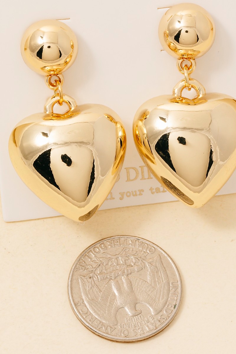 • This pair of drop earrings showcases a timeless gold dipped bubble heart charm stud style. Experience the joy of accessorizing with this piece that effortlessly combines versatility and charm.