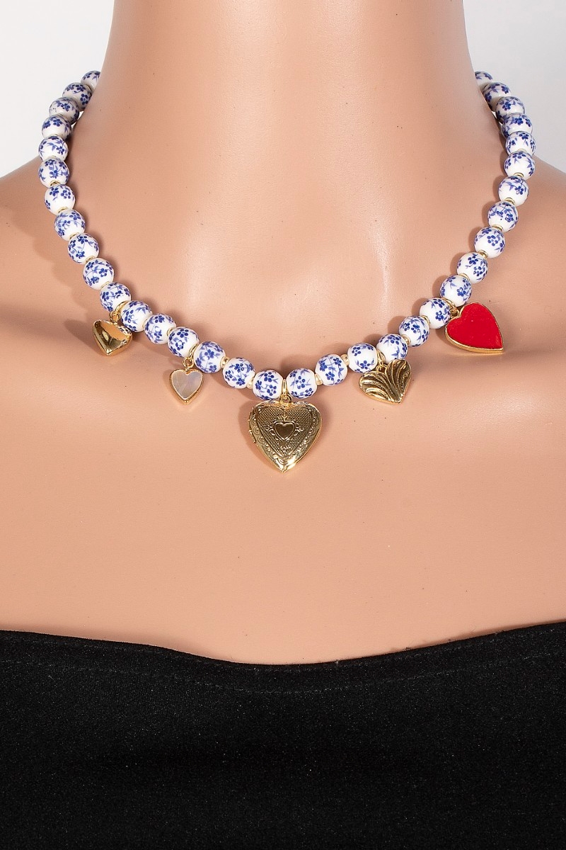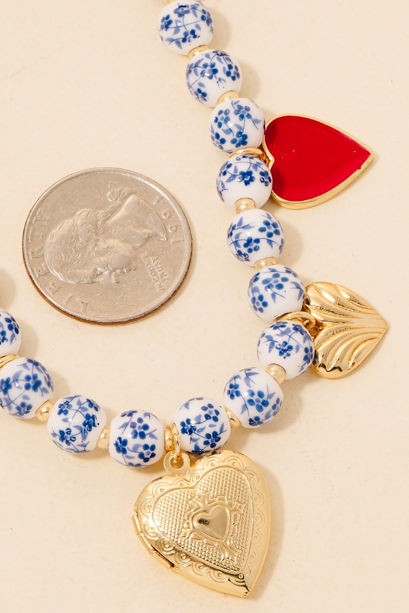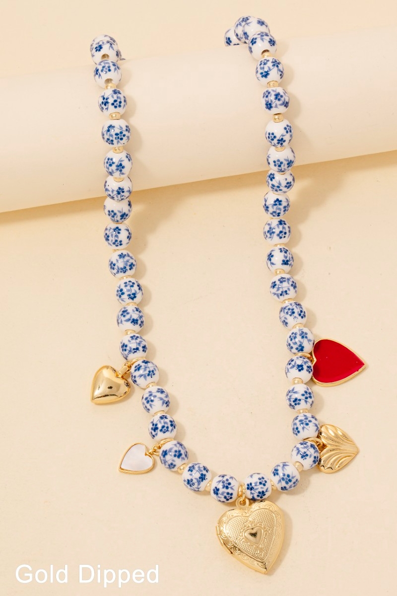 Enamel Heart And Ceramic Floral Charms Chain Necklace
