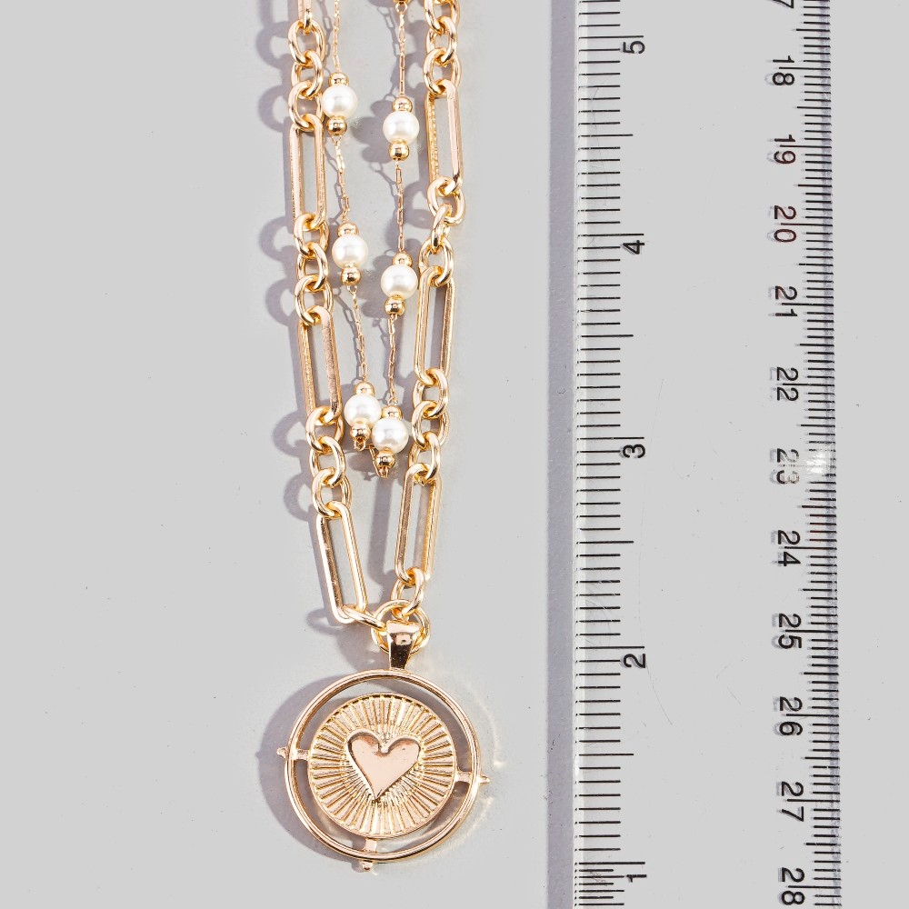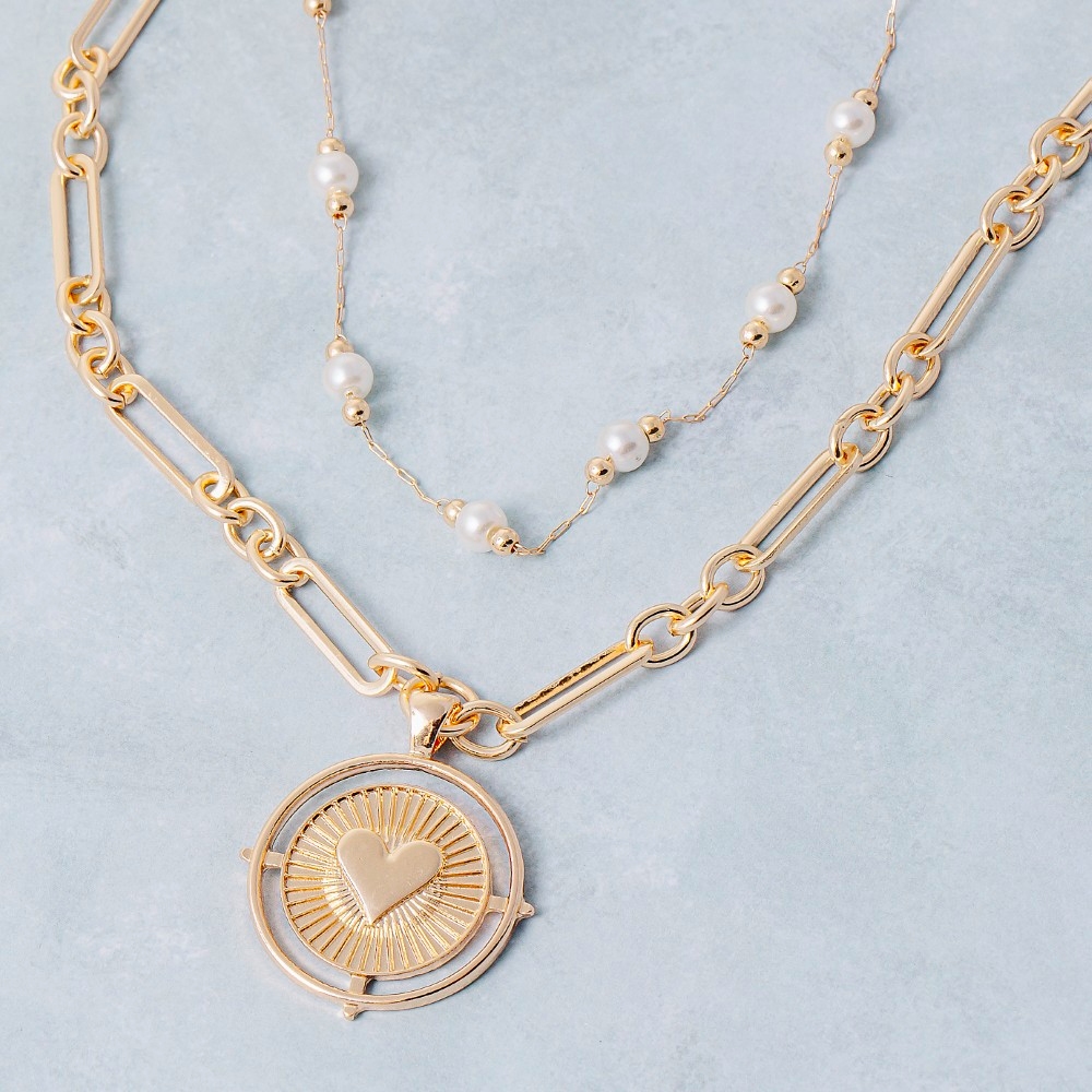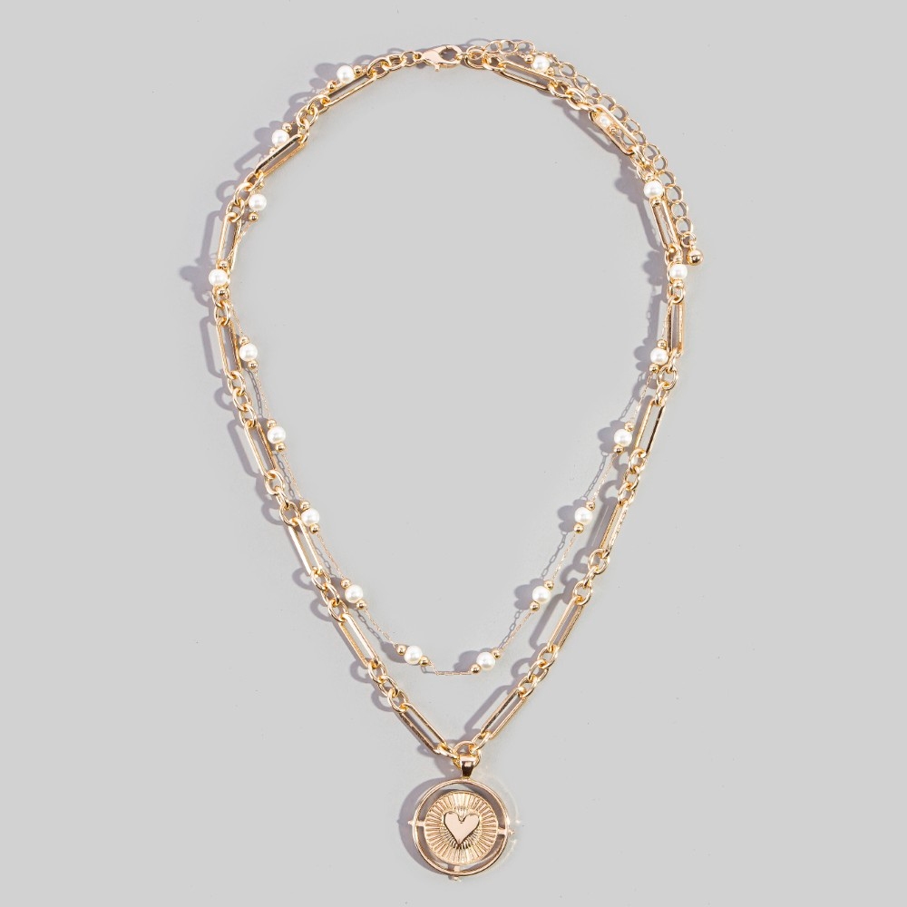 This piece is the epitome of sophistication and elegance, this pendant necklace adds a distinctive layered chain heart coin design. This item is ideal for those who want to add some personality to their outfits without being too bold. Available in GDCM. This item is sold in packs of 1.