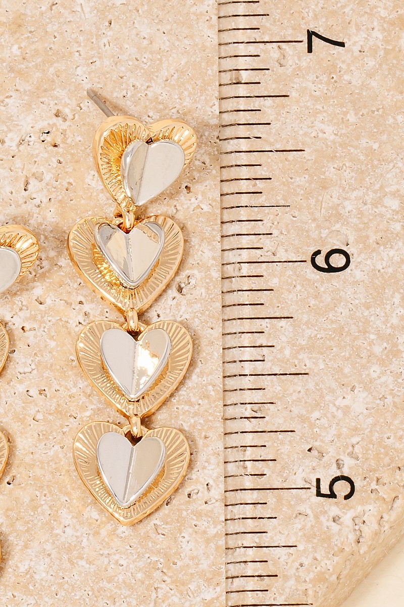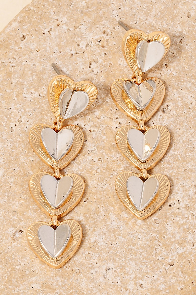 • This pair of earrings introduces a unique layered two tone hearts dangle chain style. Immerse yourself in the details of design, as this pair of earrings effortlessly becomes a conversation starter.