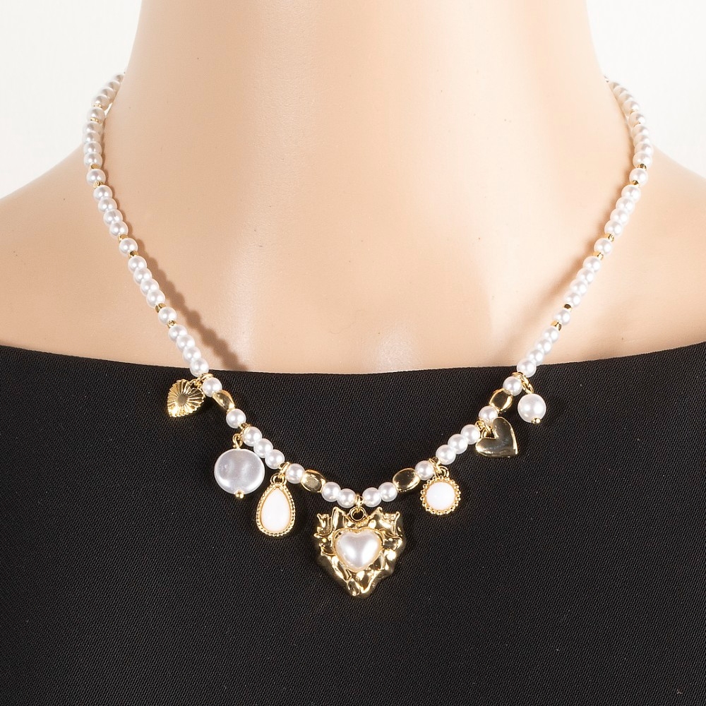 - This is the perfect necklace for any occasion necklace brings a one-of-a-kind mixed heart charms pearl and metallic beaded design. This necklace is a great way to add some flair to your outfit without going over the top. Available in G. This item is sold in packs of 1.