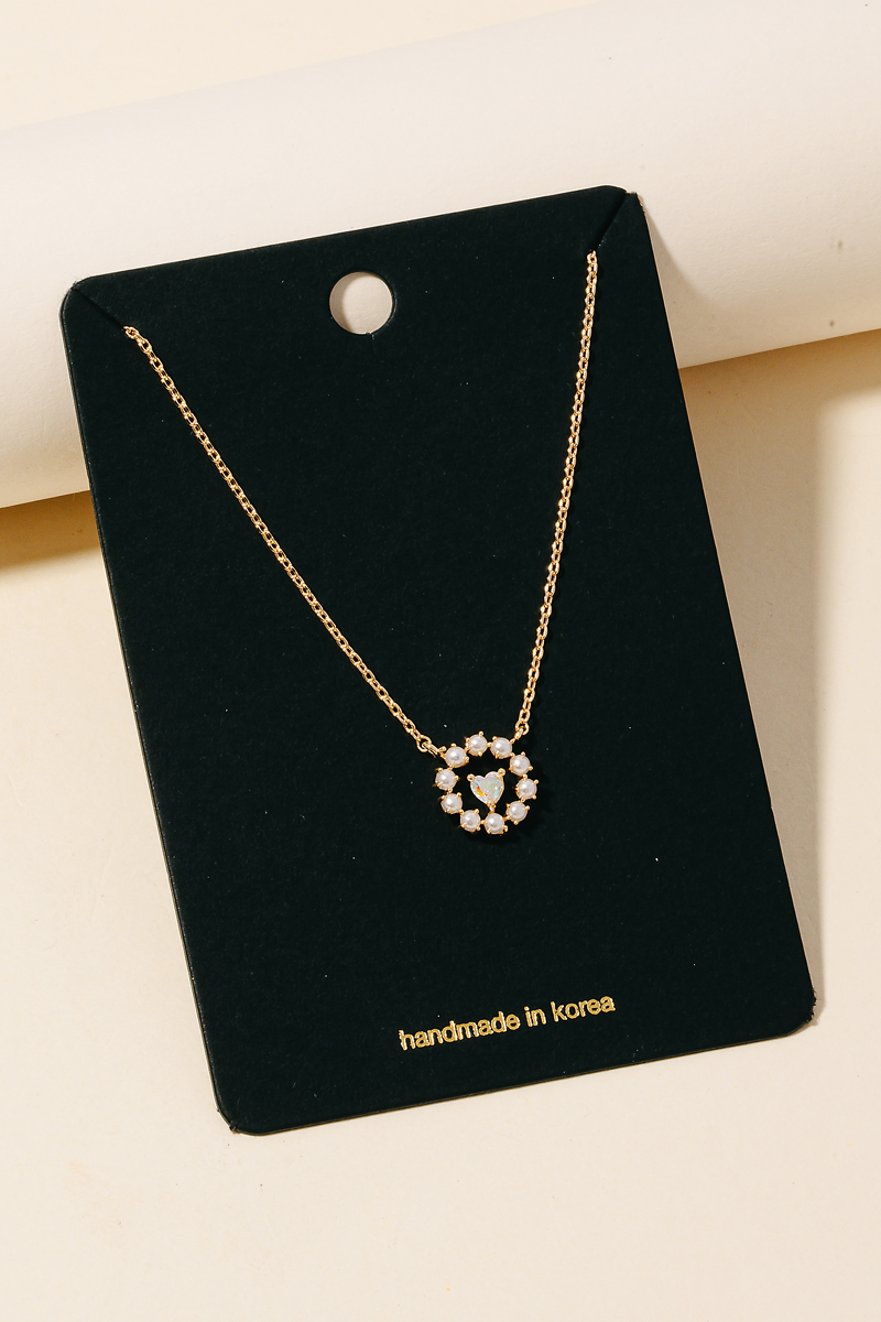• This necklace features a fashionable pearl studded halo iridescent heart pendant style. Celebrate individual style with this versatile, eye-catching addition.