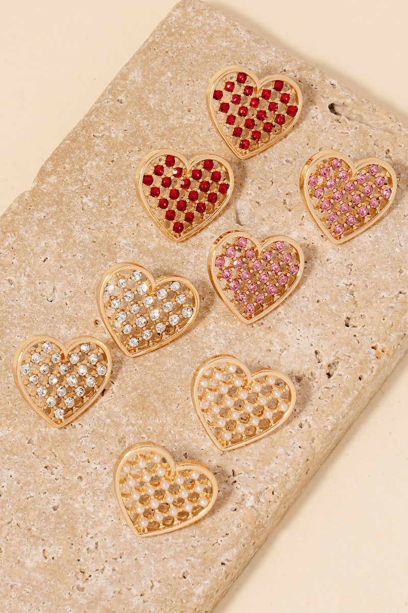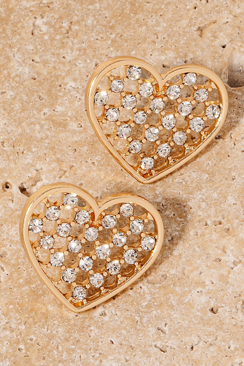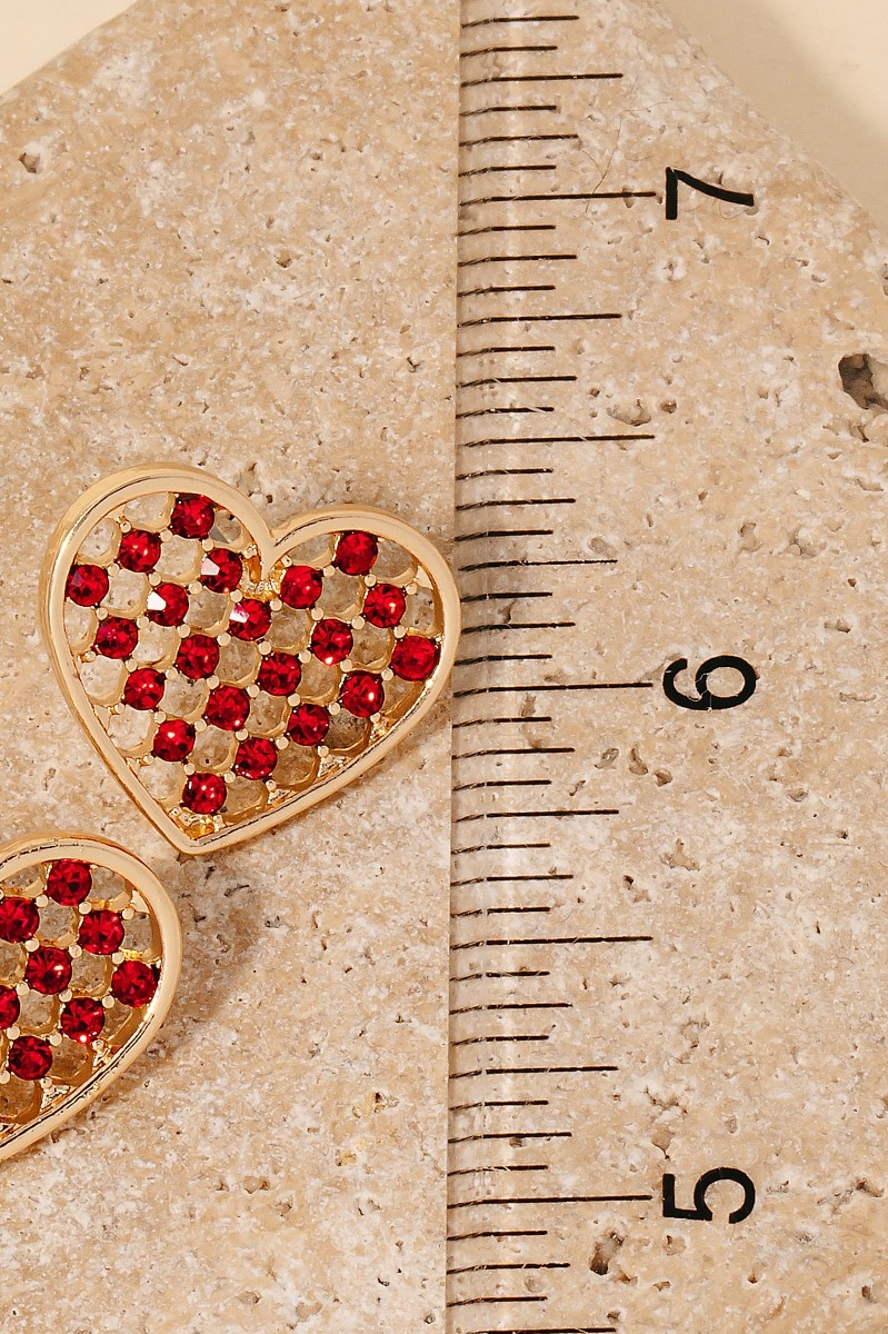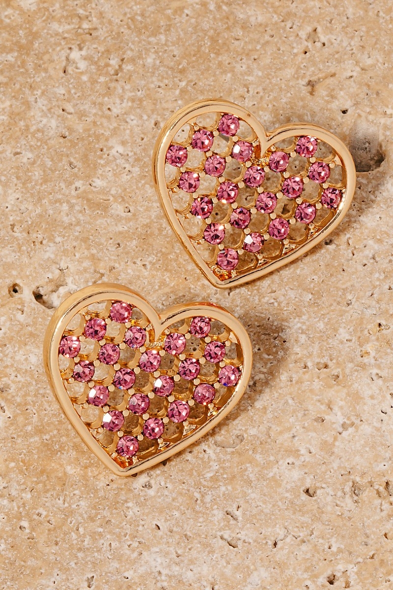• A modern classic, this pair of stud earrings brings a one-of-a-kind pave mesh heart design. This pair of stud earrings is the perfect finishing touch to any outfit, adding a touch of sophistication and glamour. Available in GD, GDCRM, LPK and RED. This item is sold in packs of 1.