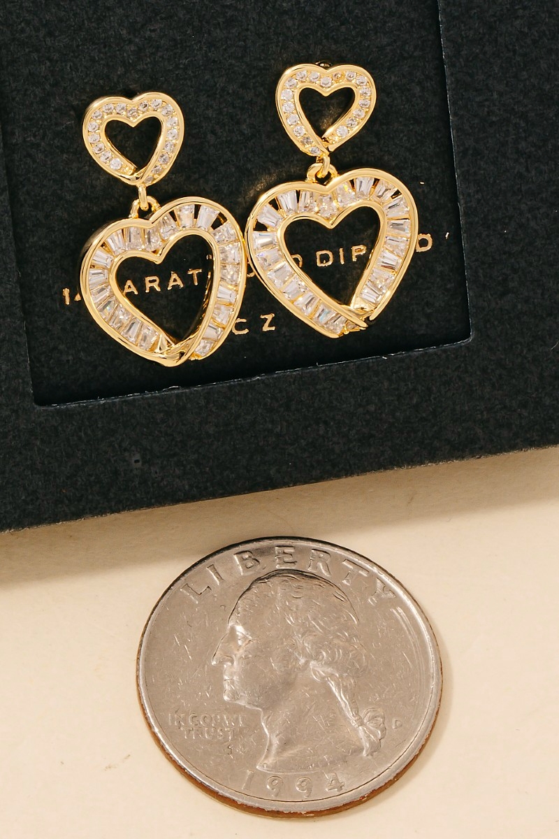 This pair of drop earrings introduces a stunning gold dipped cubic zirconia baguette double heart style. Immerse yourself in fashion finesse with this statement pair of drop earrings.
