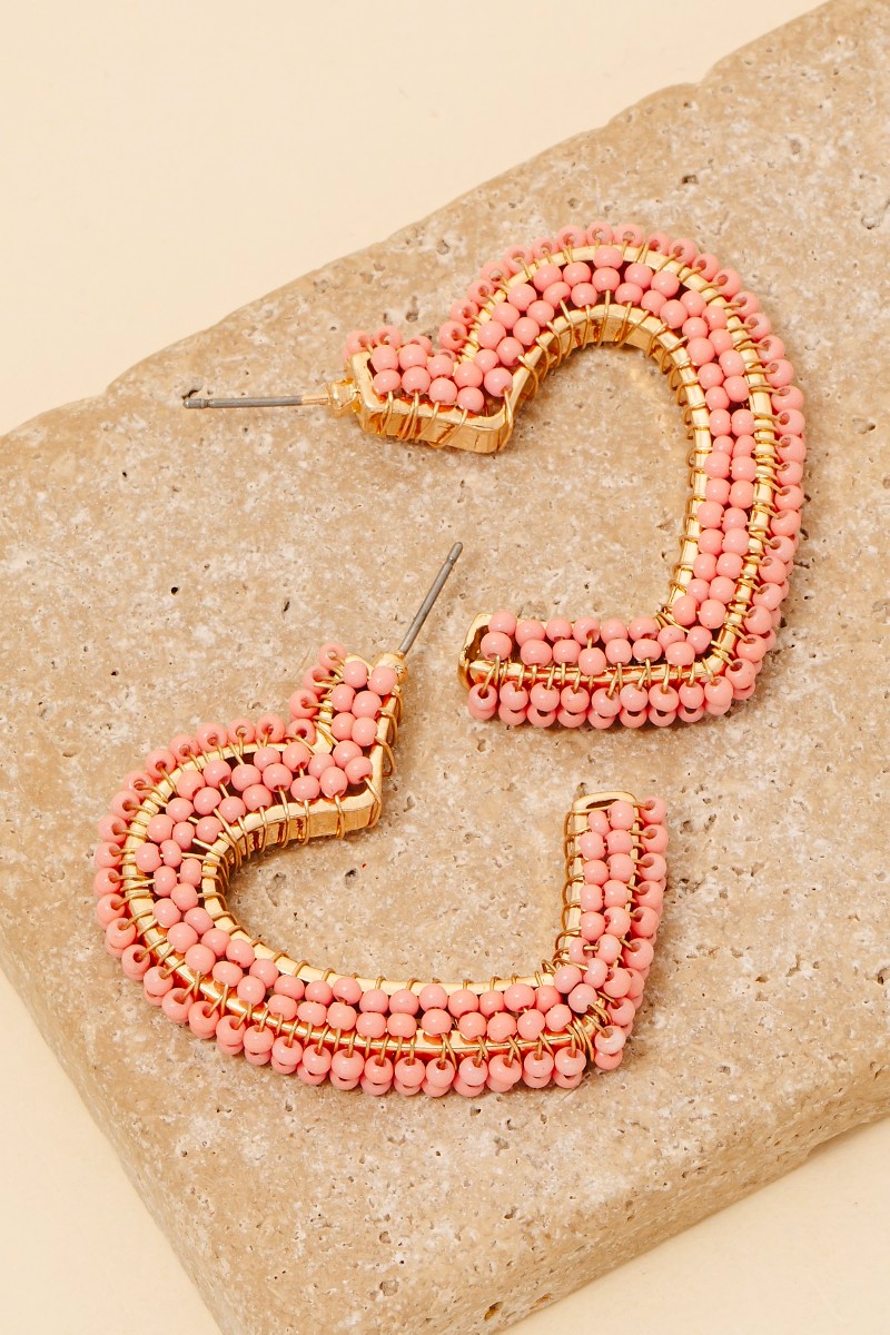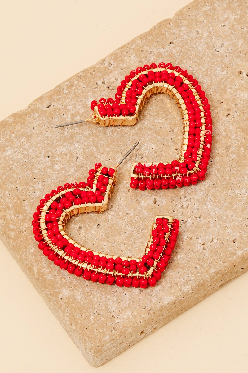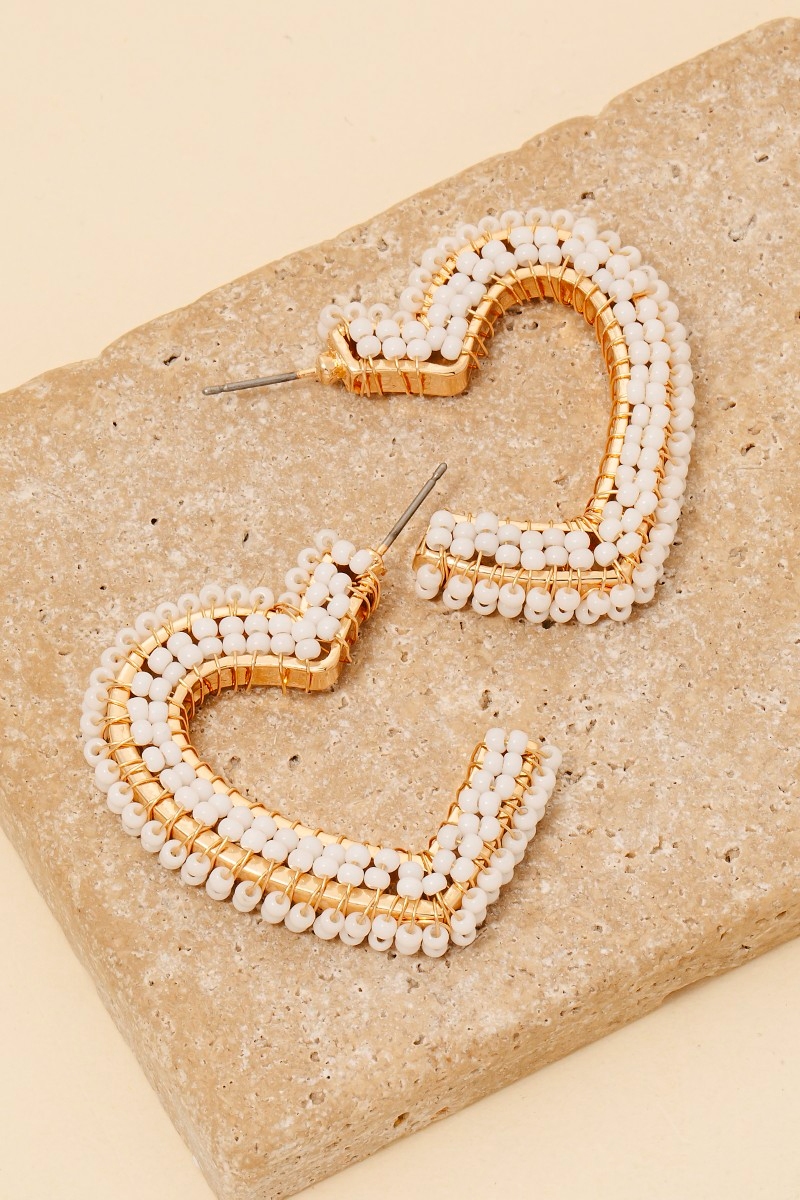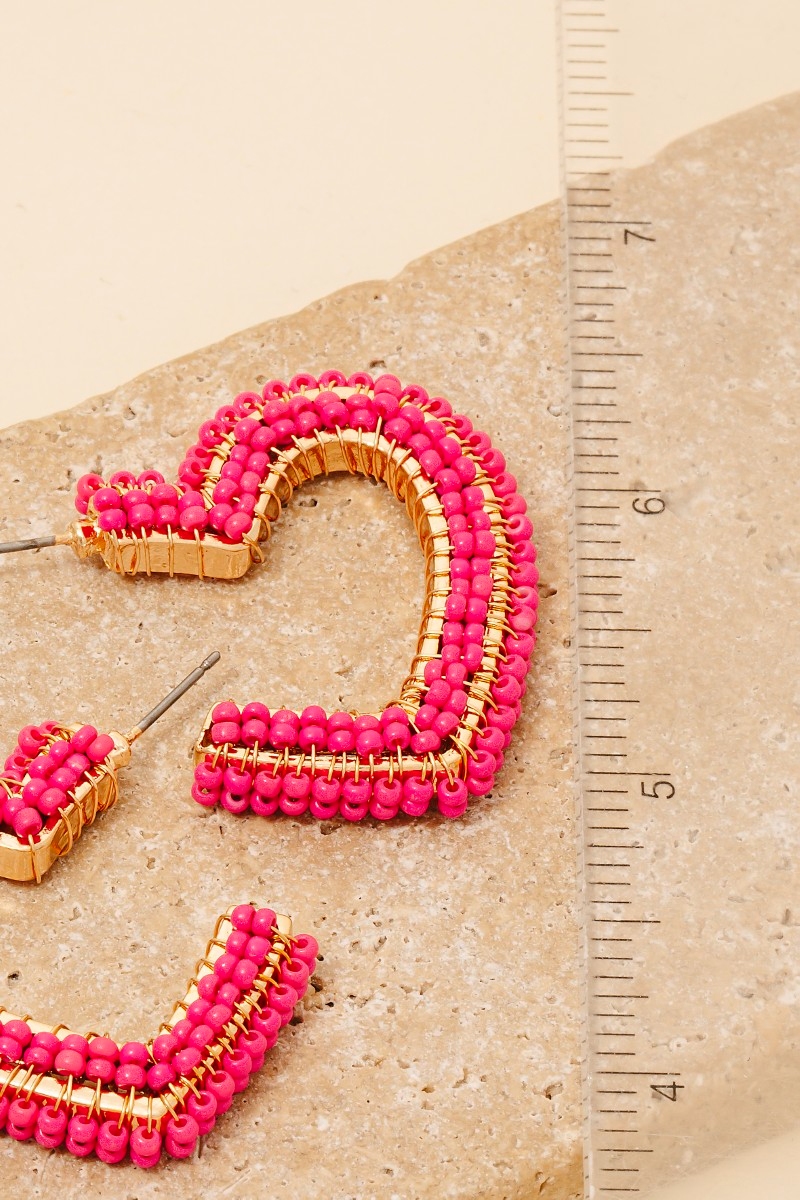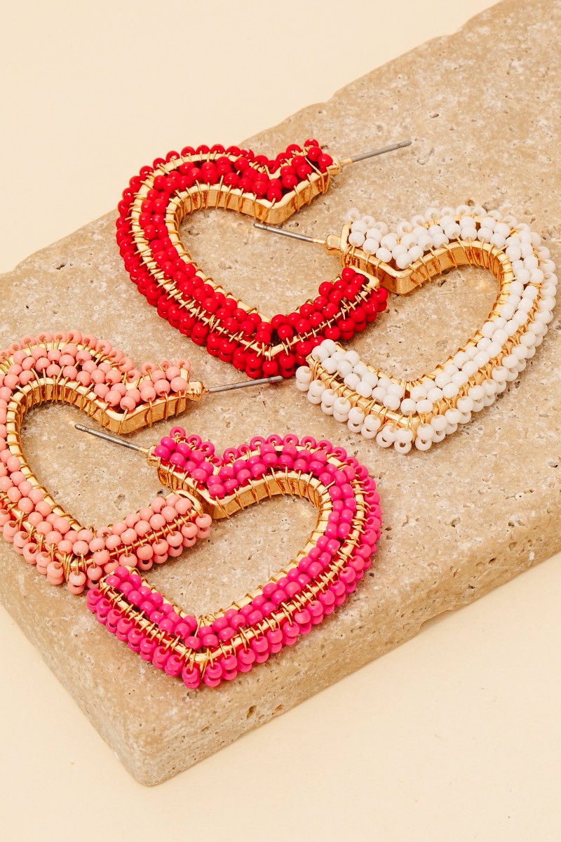 • Stay on-trend and stand out from the crowd, this pair of hoop earrings showcases a breathtaking seed beaded heart design. This pair of hoop earrings is the perfect way to add a touch of elegance to any outfit. Available in GPK, HPK, LRD, WH. This item is sold in packs of 1.