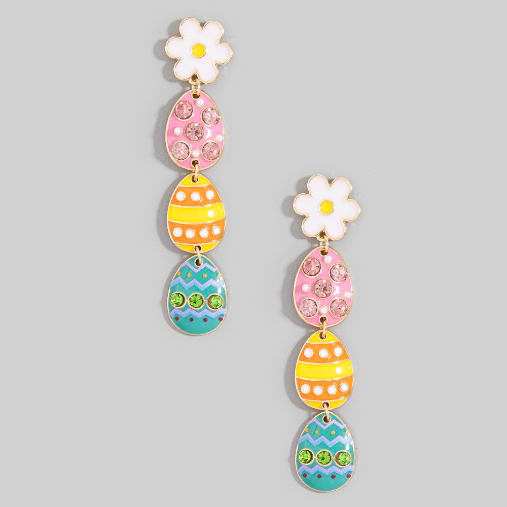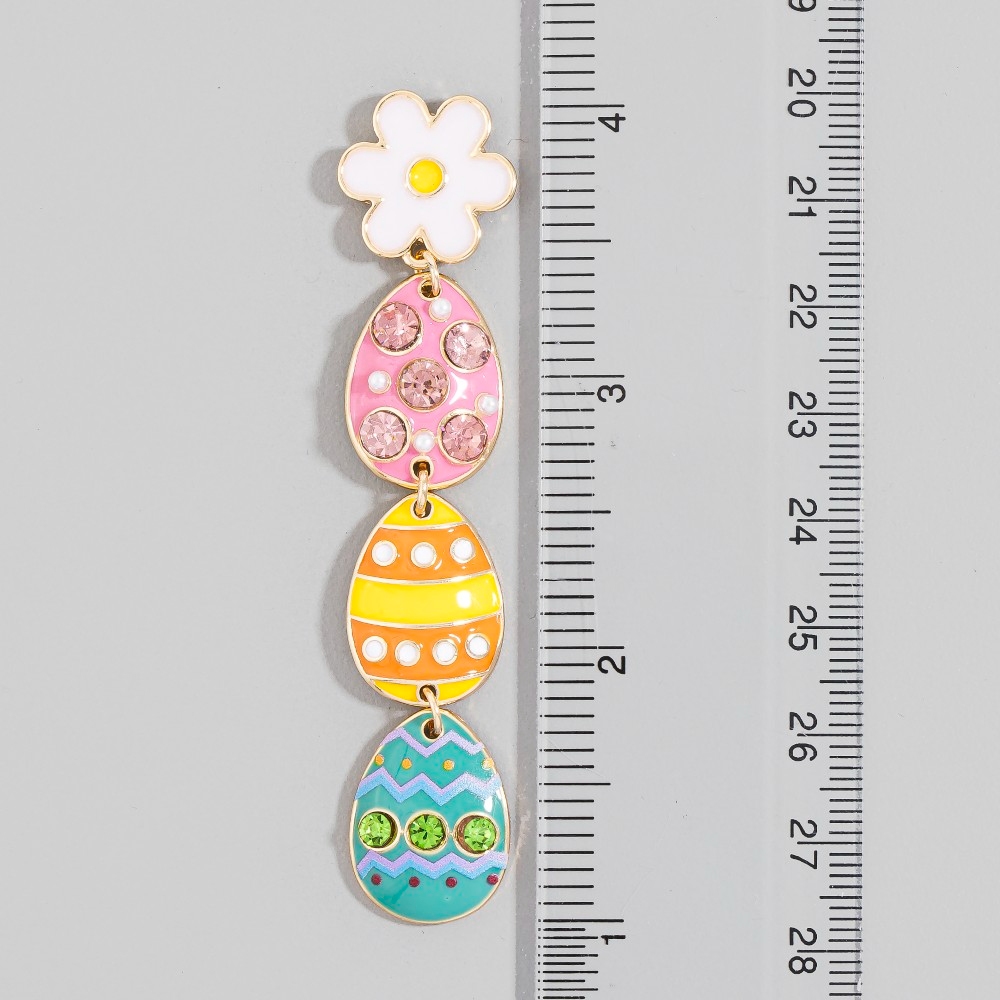 This piece is both elegant and versatile, this pair of earrings displays a unique enamel easter eggs and flower dangle chain design. The perfect way to elevate any outfit, this pair of earrings adds a touch of elegance and style. Available in MT. This item is sold in packs of 1.