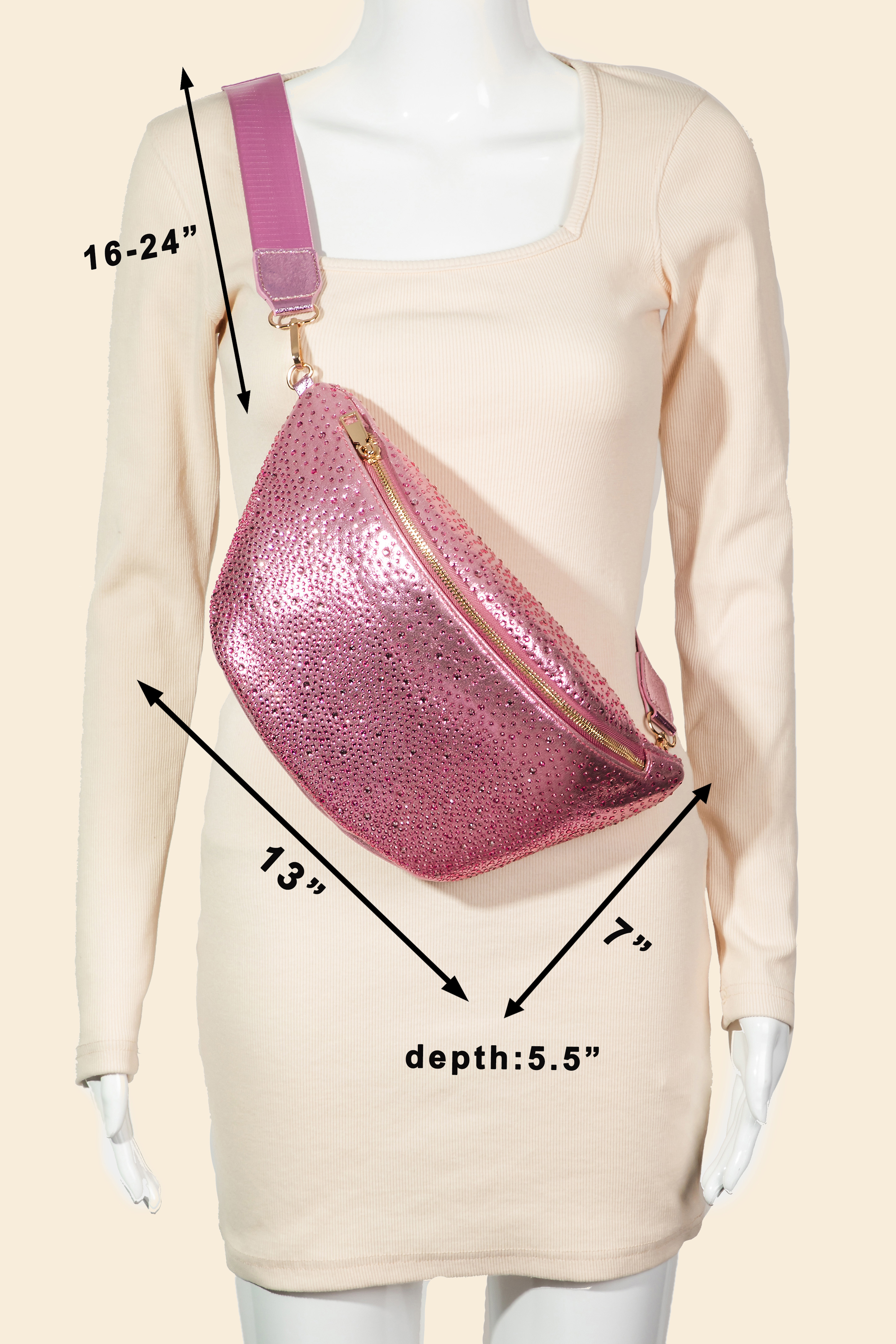 Elevate your style with something unique and daring, this crossbody bag adds a distinctive rhinestone studded fanny pack design. Infuse a hint of luxury into your daily attire with this versatile accessory, a must-have for those who appreciate timeless elegance. Available in BK, DDN, LDN, PK and S. This item is sold in packs of 1.
