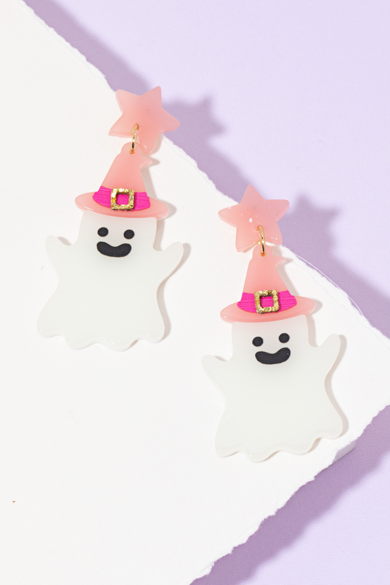 Make a statement, this pair of dangle earrings includes a stunning glow in the dark witch hat ghost design. This item is a great way to add some texture and dimension to any outfit. Available in MT and PK.