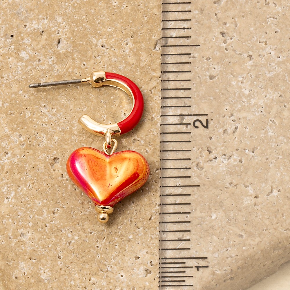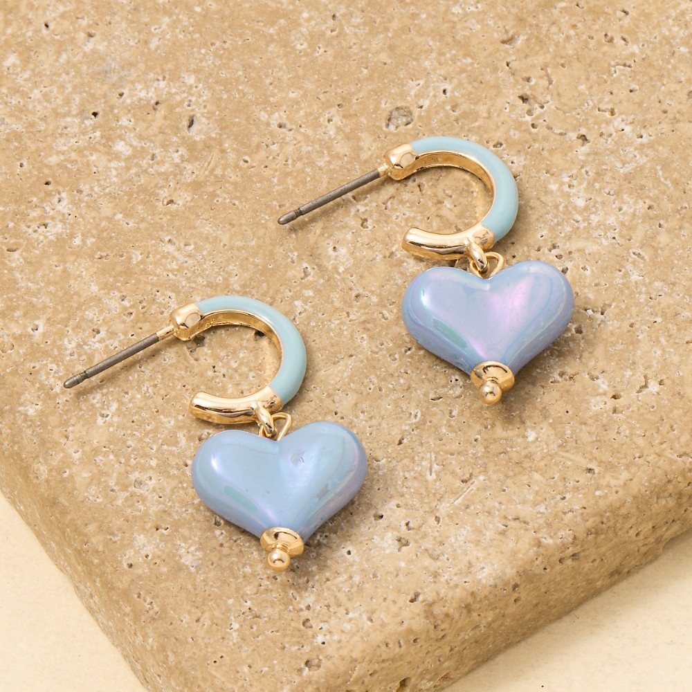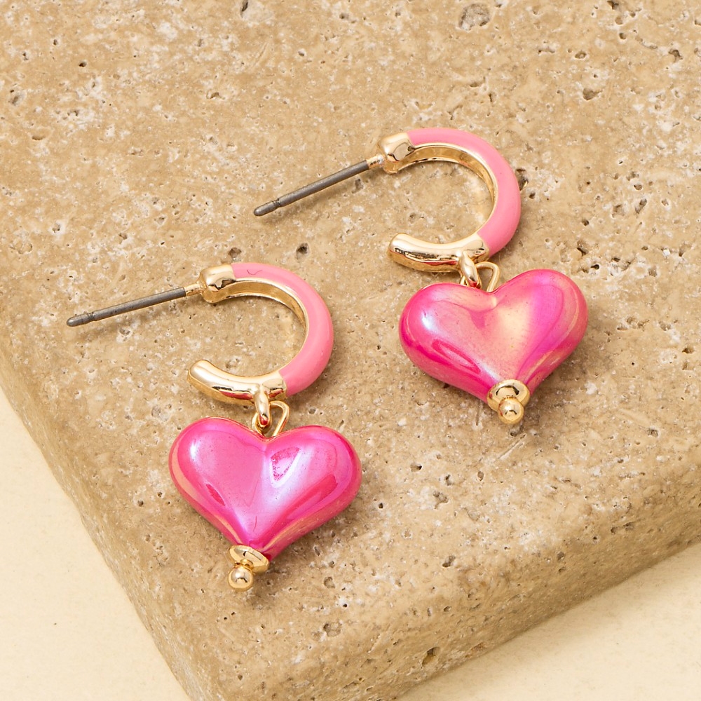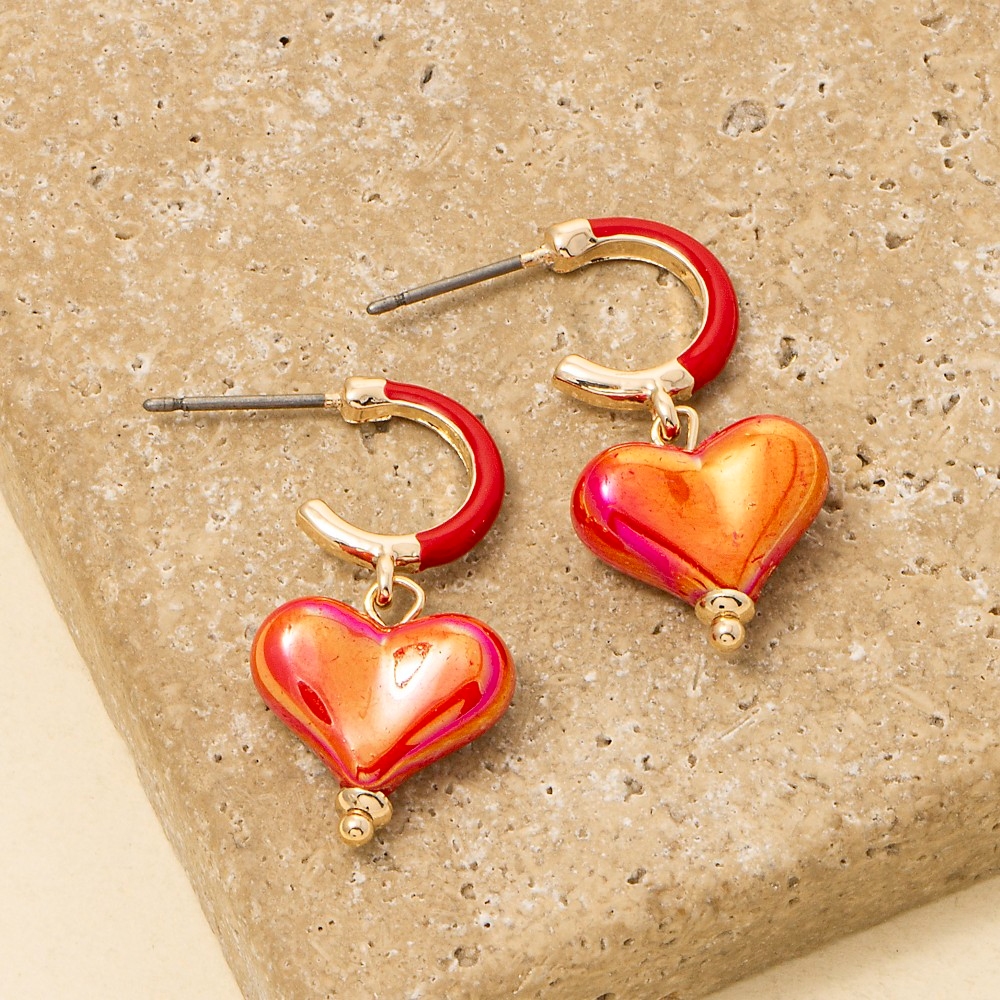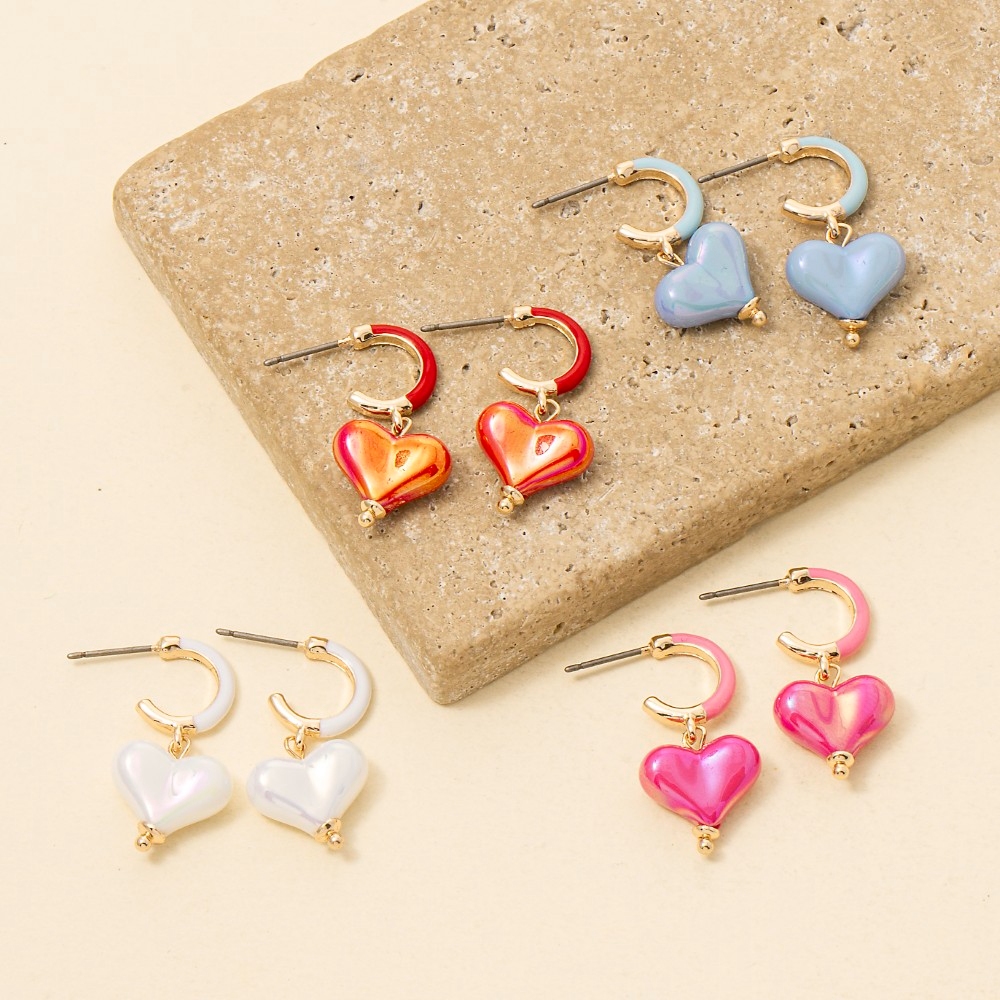 • Sleek, modern, and always stylish, this pair of hoop earrings emanates an elegant iridescent heart charm design. Perfect for any occasion, this versatile pair of hoop earrings will enhance any outfit you wear. Available in BLUEGD, PINKGD, REDGD, WHITEGD. This item is sold in packs of 1.