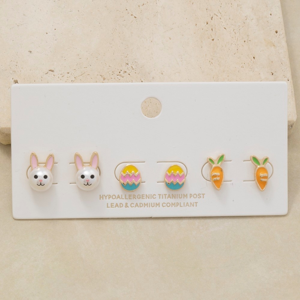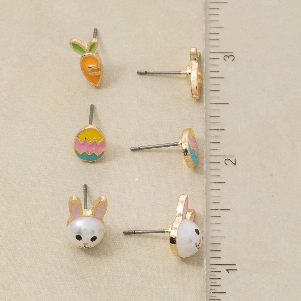 - The perfect way to add some sparkle to your outfit, this pair of stud earrings exudes a refined mini easter themed set design. Redefine your fashion identity with this versatile pair of stud earrings, a timeless piece that complements any wardrobe. Available in GD. This item is sold in packs of 1.