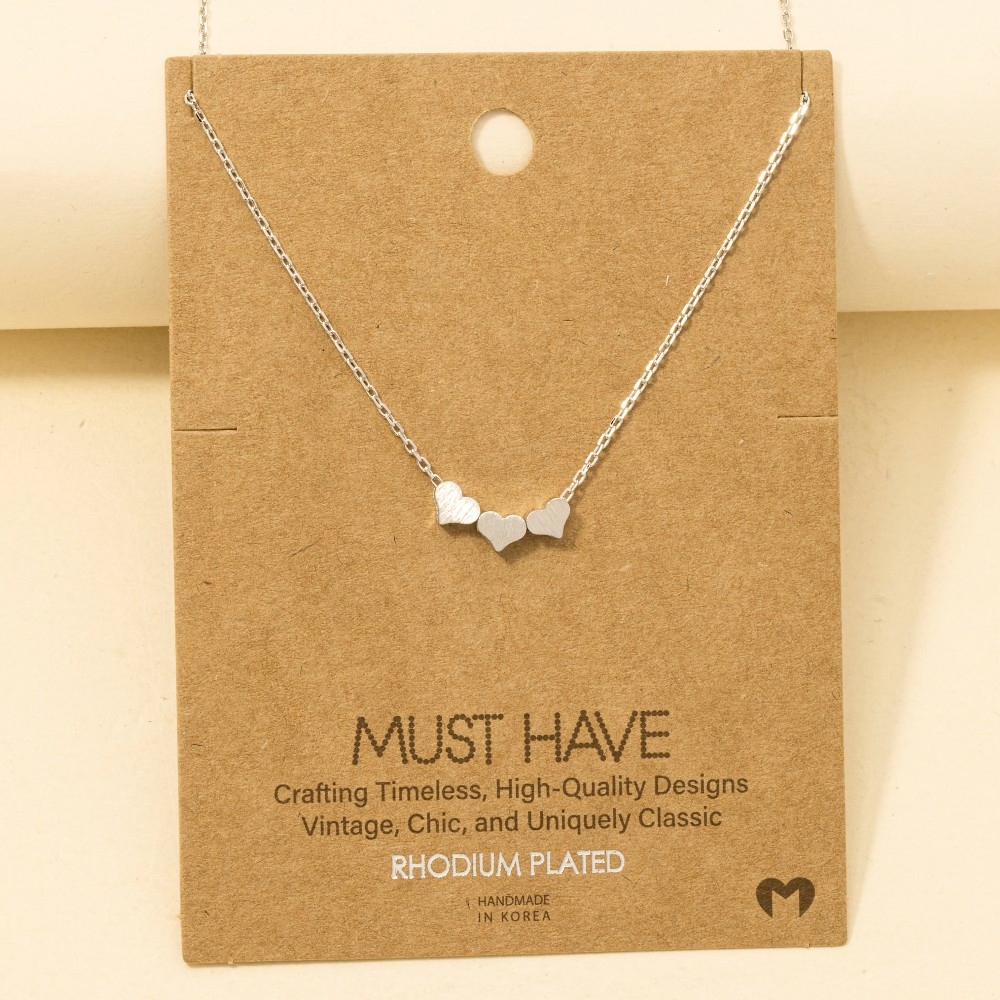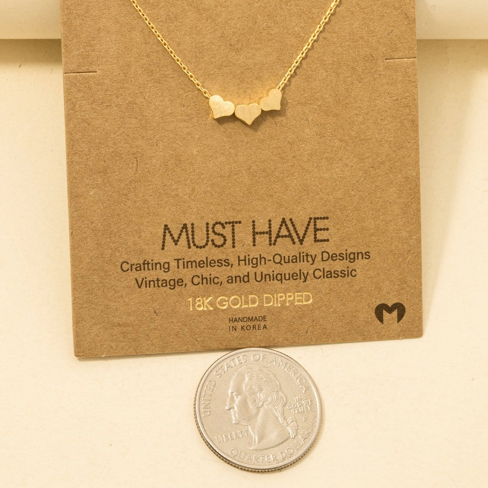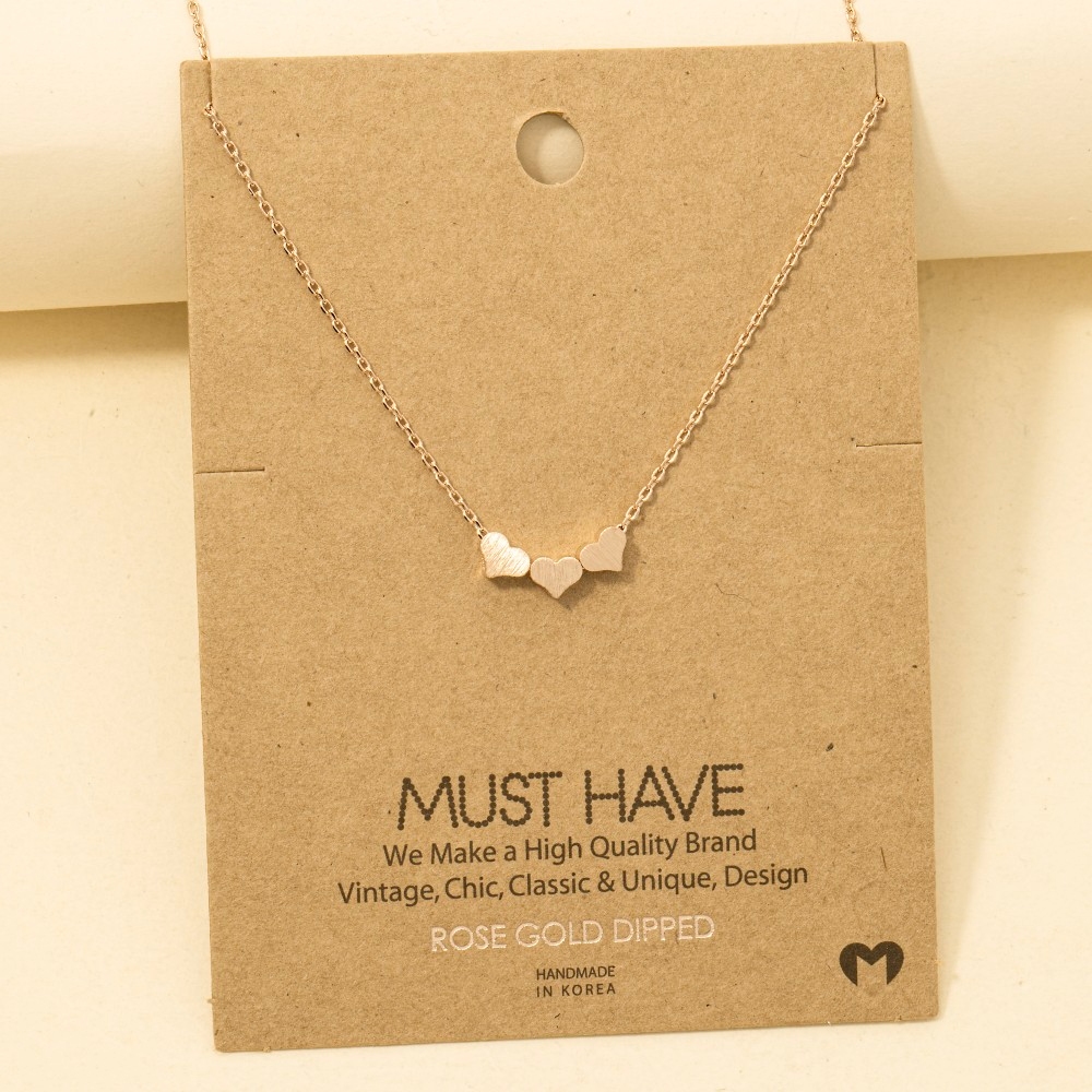 • The perfect way to complete any outfit, this trending necklace exudes a refined three dainty hearts necklace design. Experience the transformative power of this versatile trending necklace, effortlessly enhancing the overall aesthetic of your outfit. Available in G, MG, MR, MS, S and R. This item is sold in packs of 1.