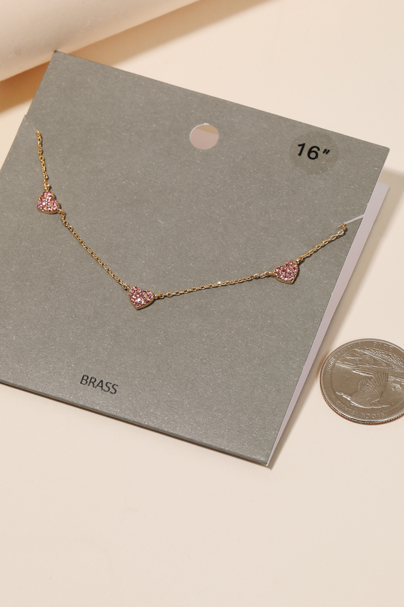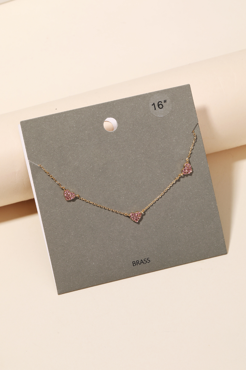 A new popular trending necklace features a beautiful dainty chain mini heart charm necklace design. Perfect for the coming Spring season. Available in GDCRY and GDROS. This item is sold in packs of 2.